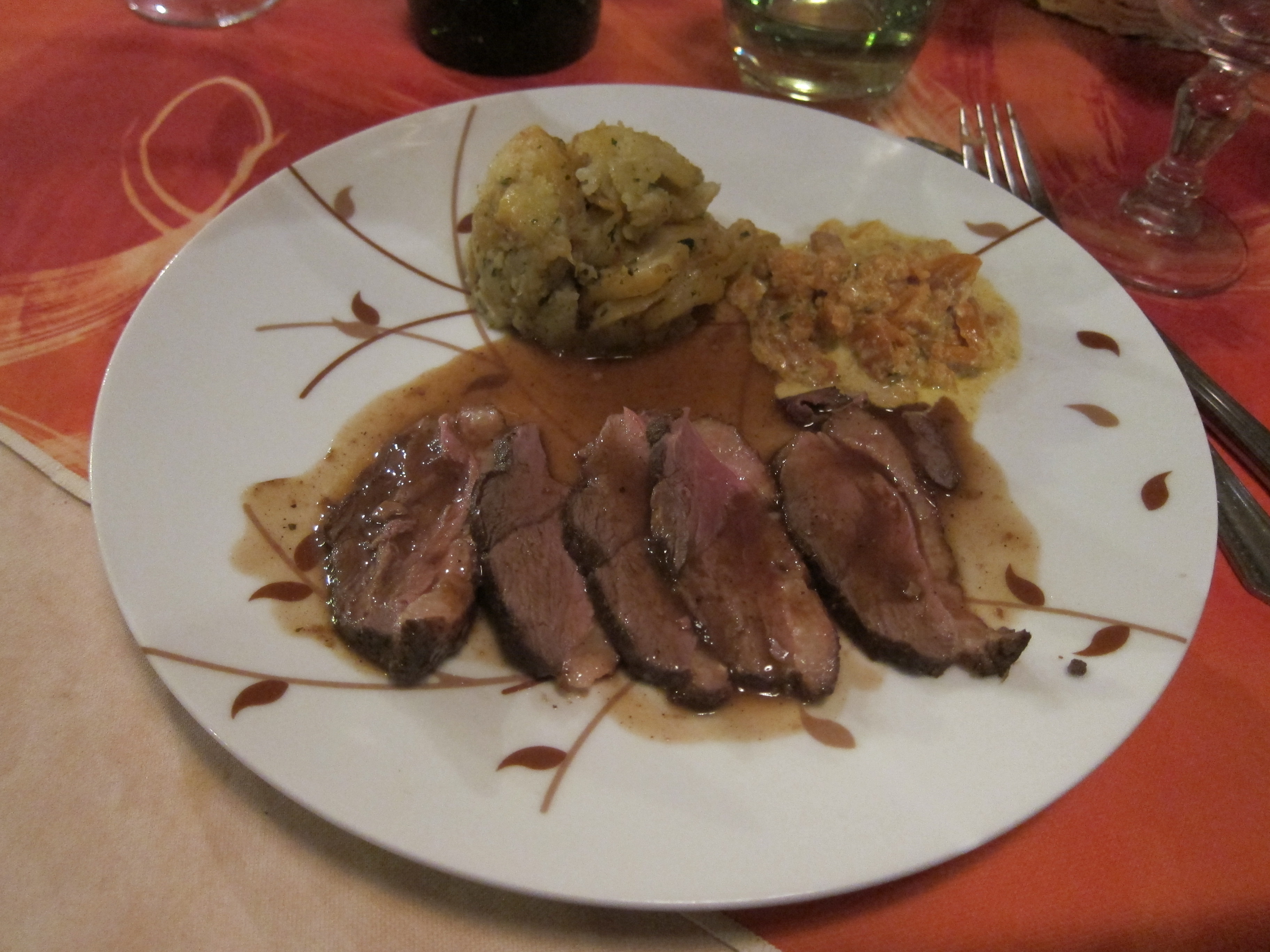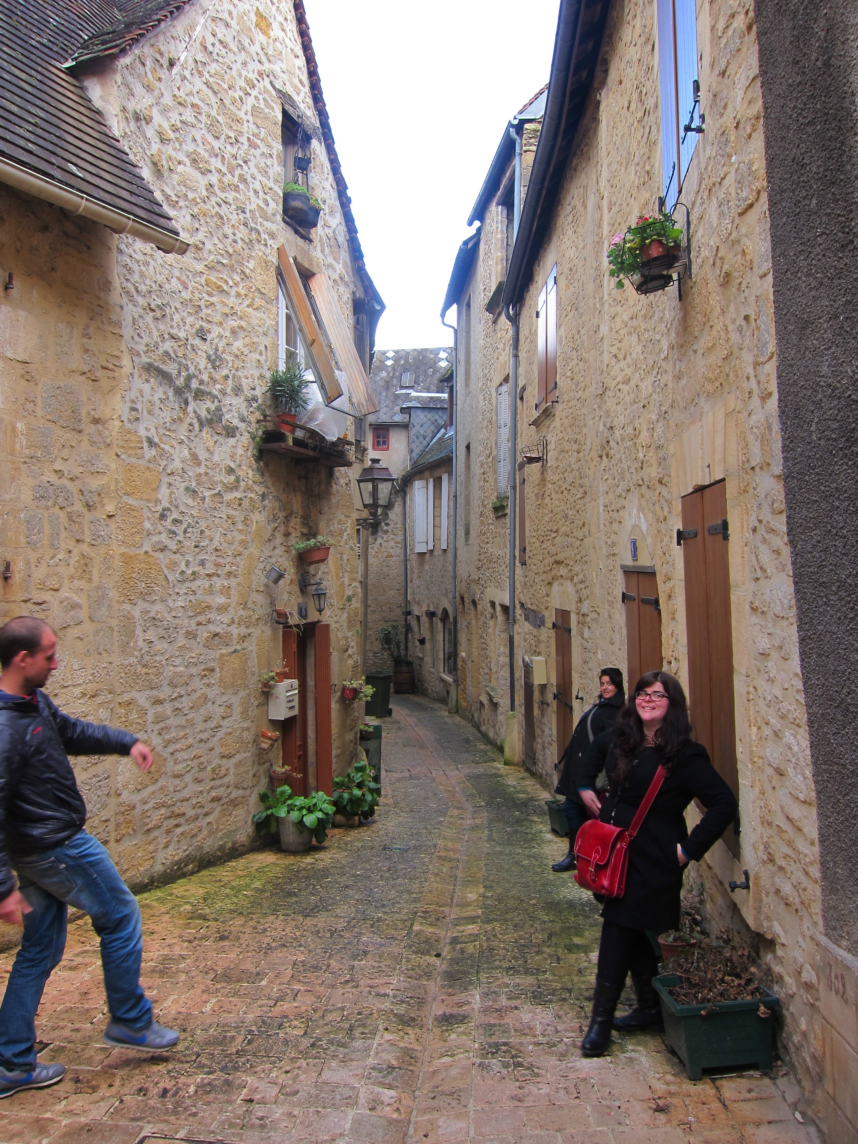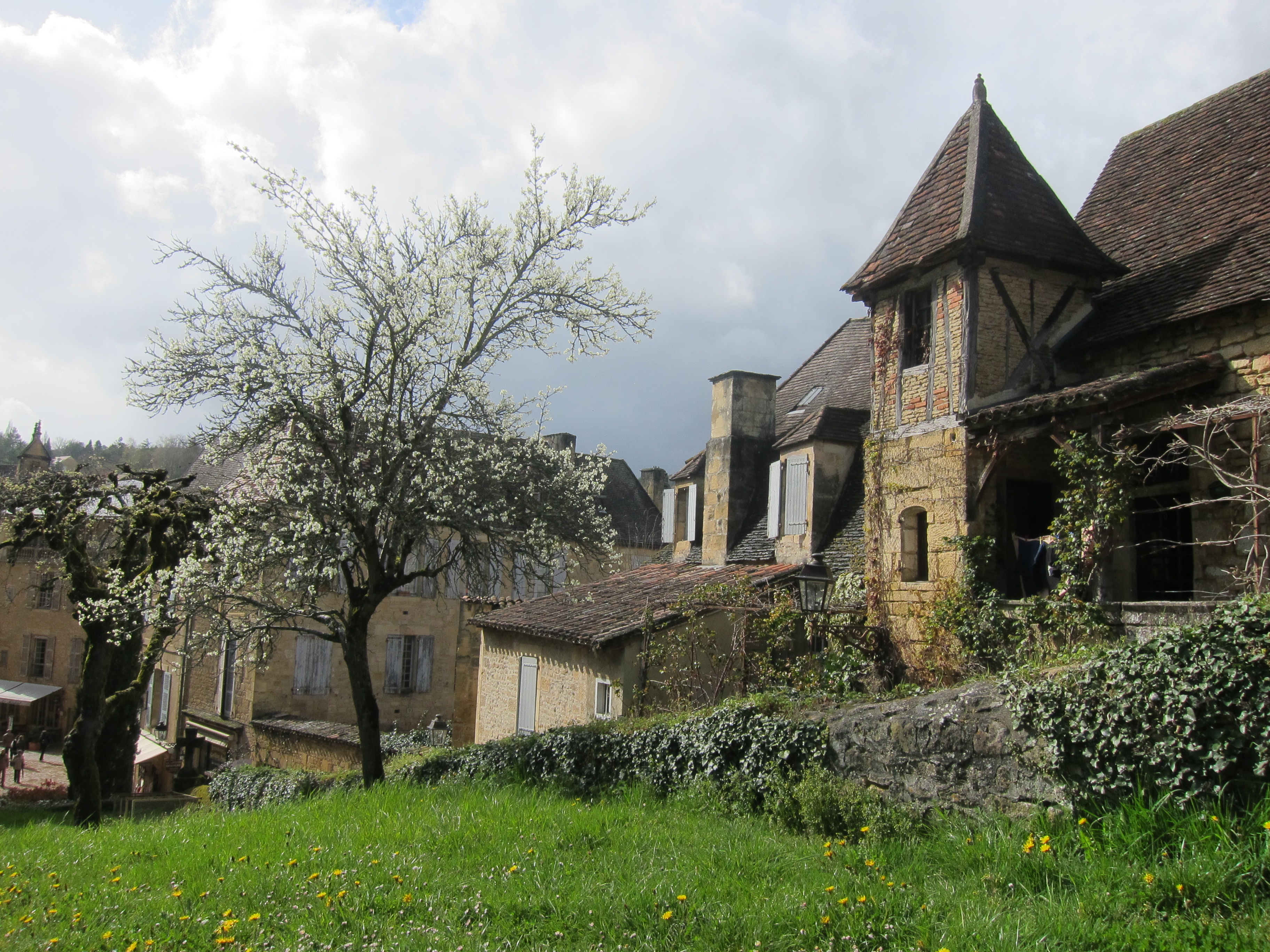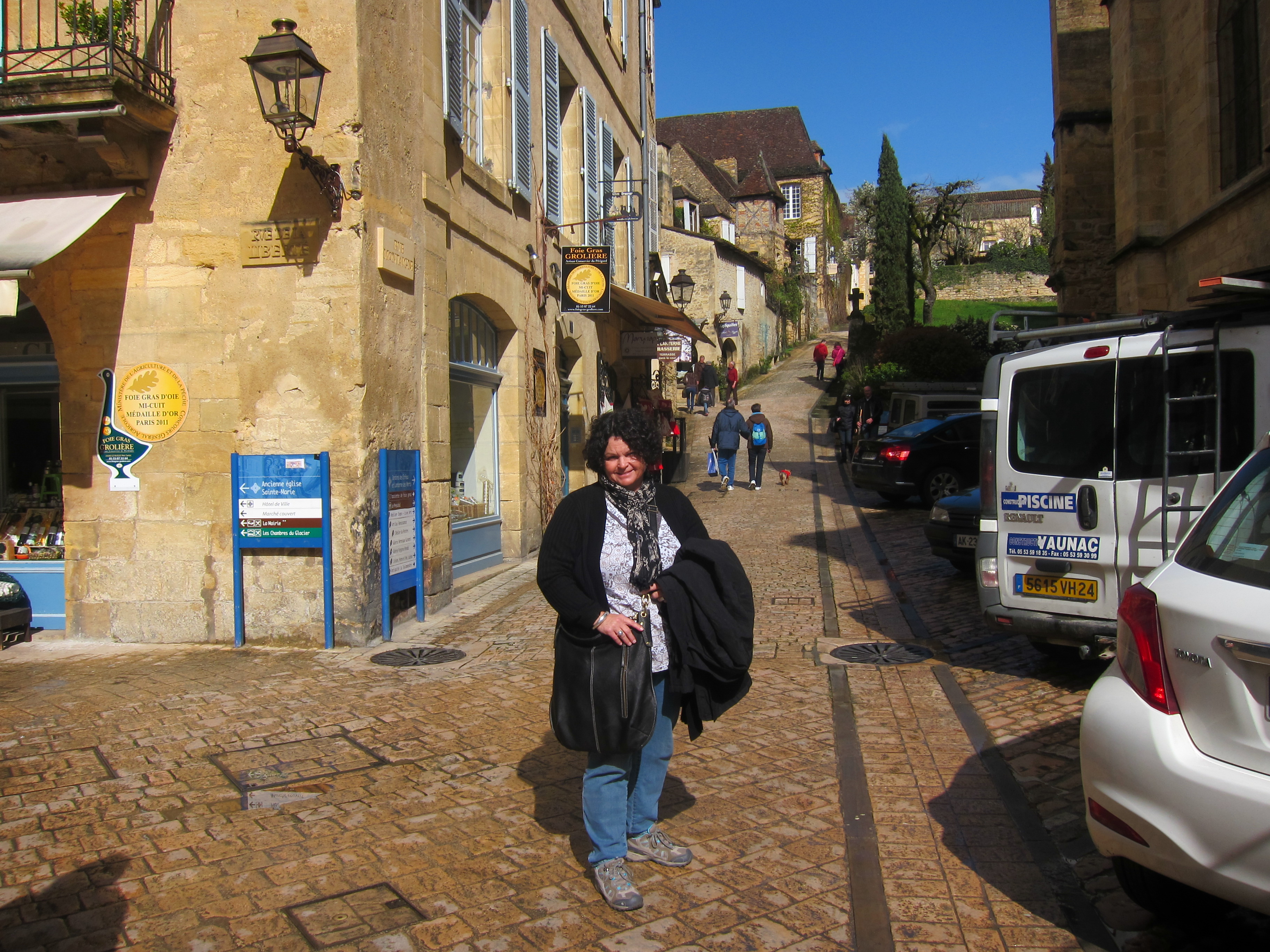 Caught a train from Tours for an hour and a half and changed trains journeying through the french countryside for 3 hours to Aurrilac. We disembarked and, to quote our leader Jaime, “make a picnic “at the entrance to the station with goodies we bought together at a supermarket…baguettes, ham, pate, salad, cheese, fruit. Then we caught another train to a little village and had to wait for a bus to bring us to the gorgeous Sarlat. We opened a bottle of red wine on the platform…a unique experience! Sarlat is really lovely and very old…very french and a gourmets delight as it specialises in regional produce of Duck and Foie Gras. We wandered through the old quarter full of traditional buildings, stone streets and lovely shops full of Foie Gras, truffle oils, red wine and duck. We dined at a very nice French restaurant on Foie gras, duck breast with truffle perfume, goats cheese, Dordogne valley red wine and the local dessert speciality all for $30…
