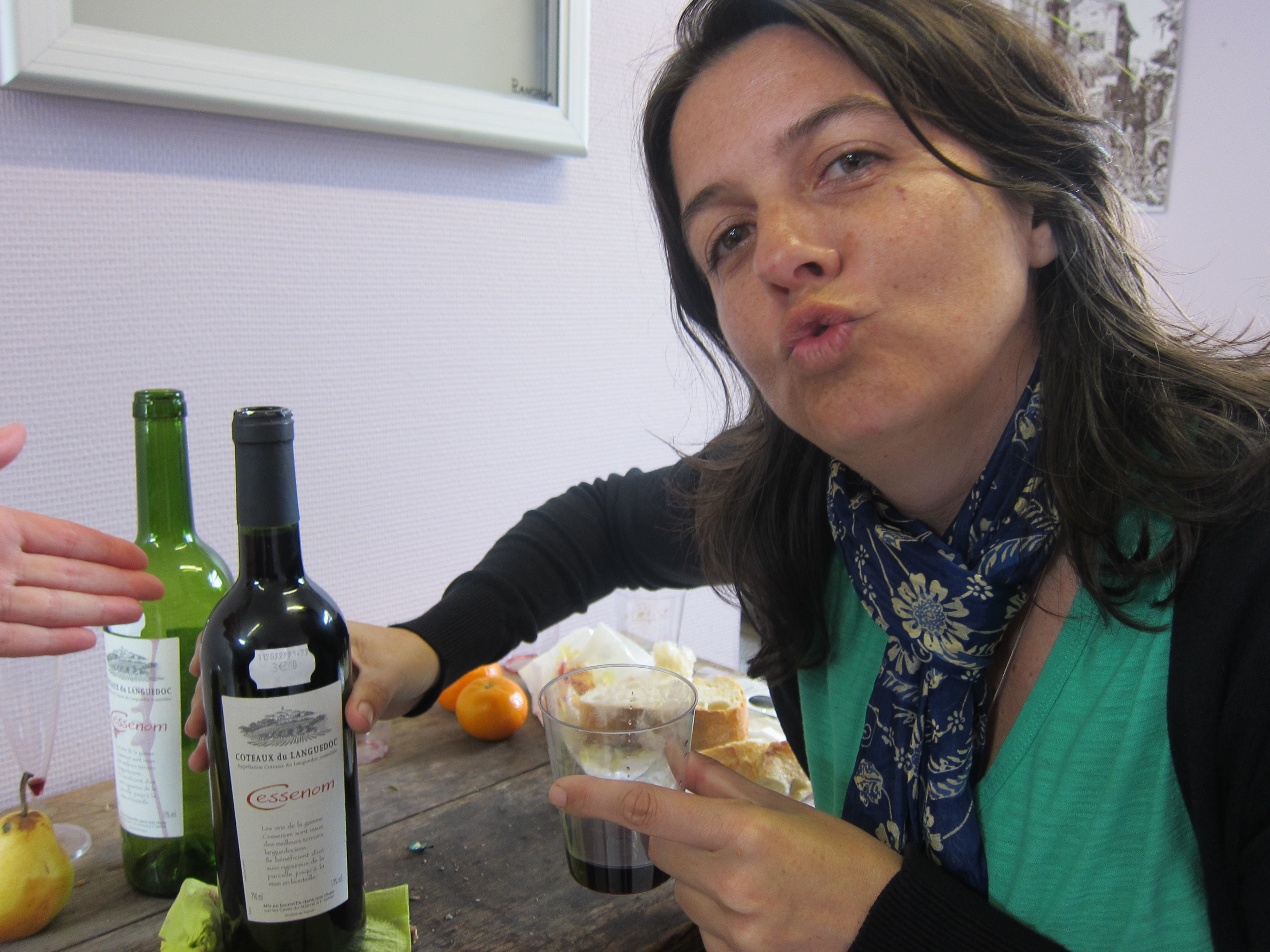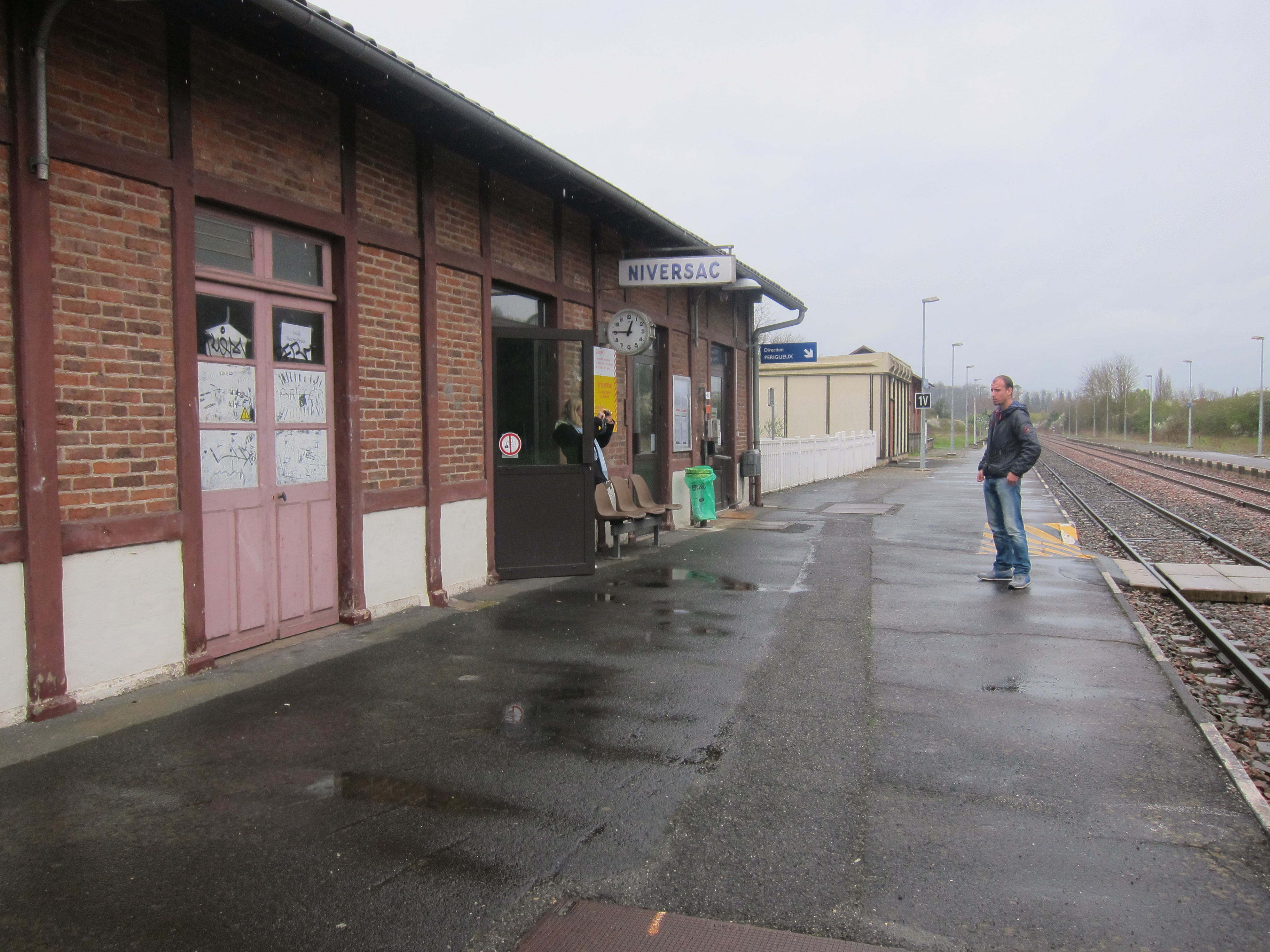 Two buses and a train through the very pretty Dordogne river valley with magnificent chateau and villages, blossoming trees and greenery. Arrived at a tiny station with and hour and a half until the train came…no cafe so we improvised, raided Louise’s stores of gourmet products and scrounged up some fresh bread and red wind for 3 euros from the service station across the road. Set up our picnic in the waiting room and enjoyed our bottles of “Chateaux des Servo” as Kisane aptly named it.