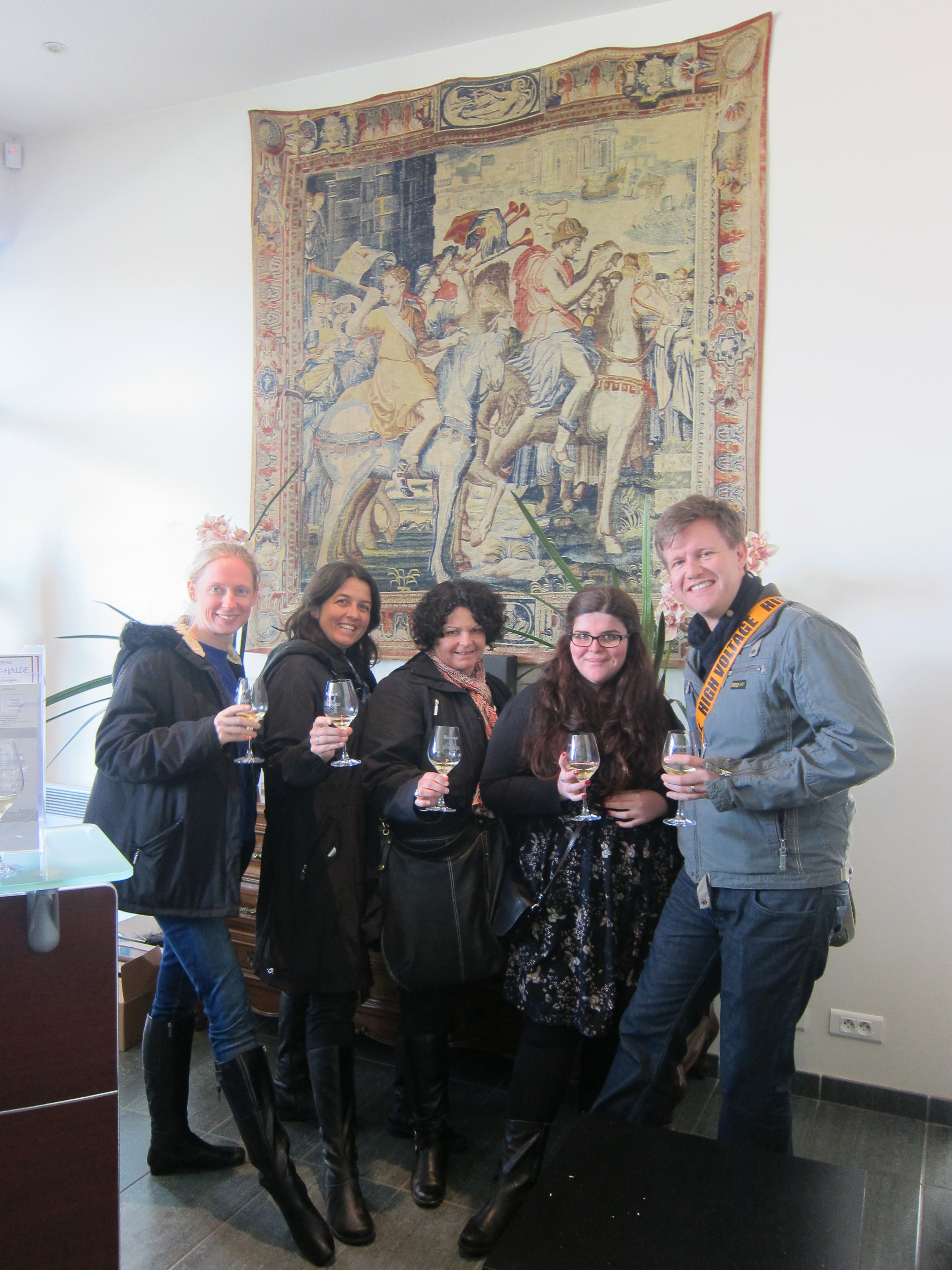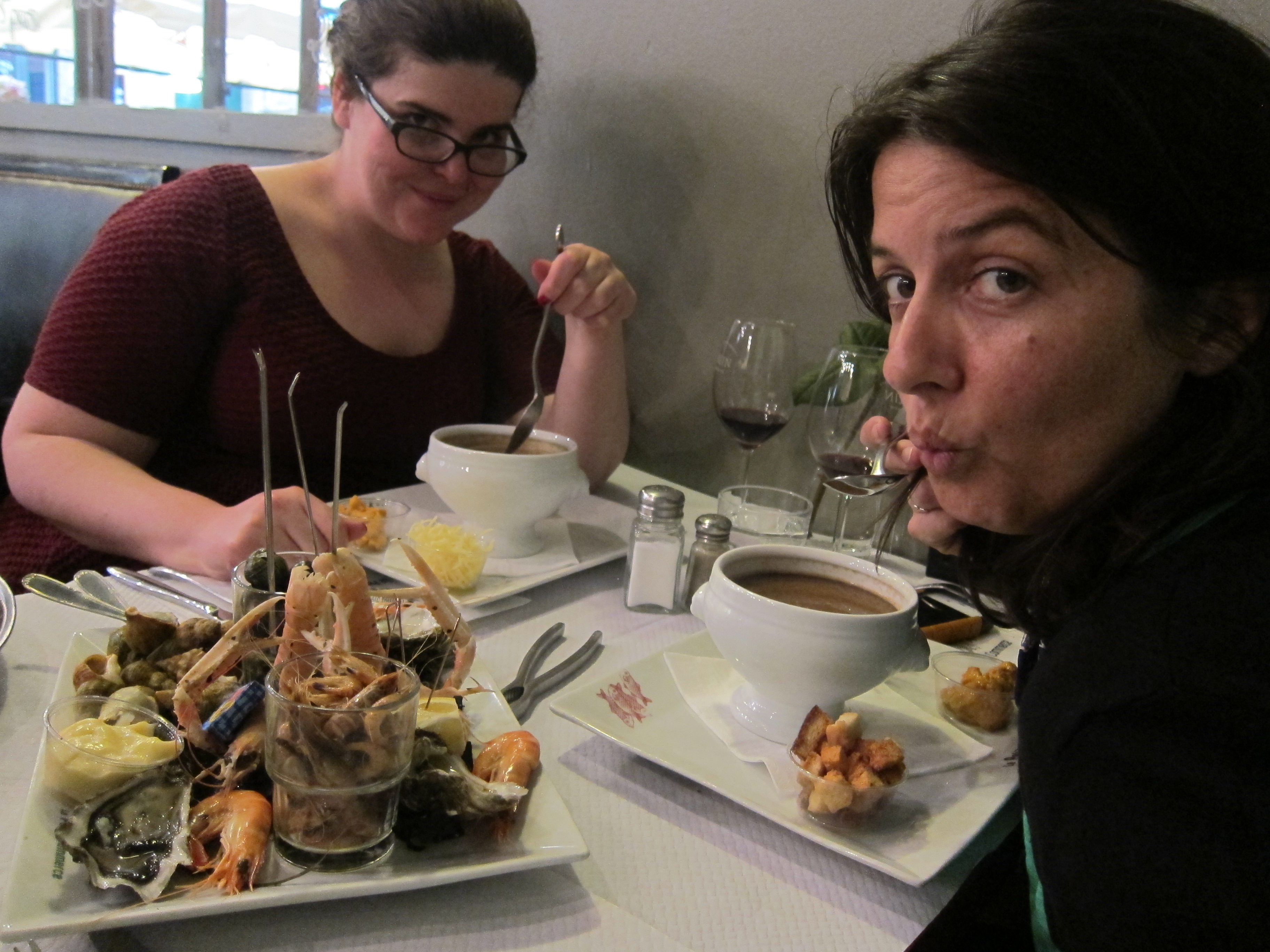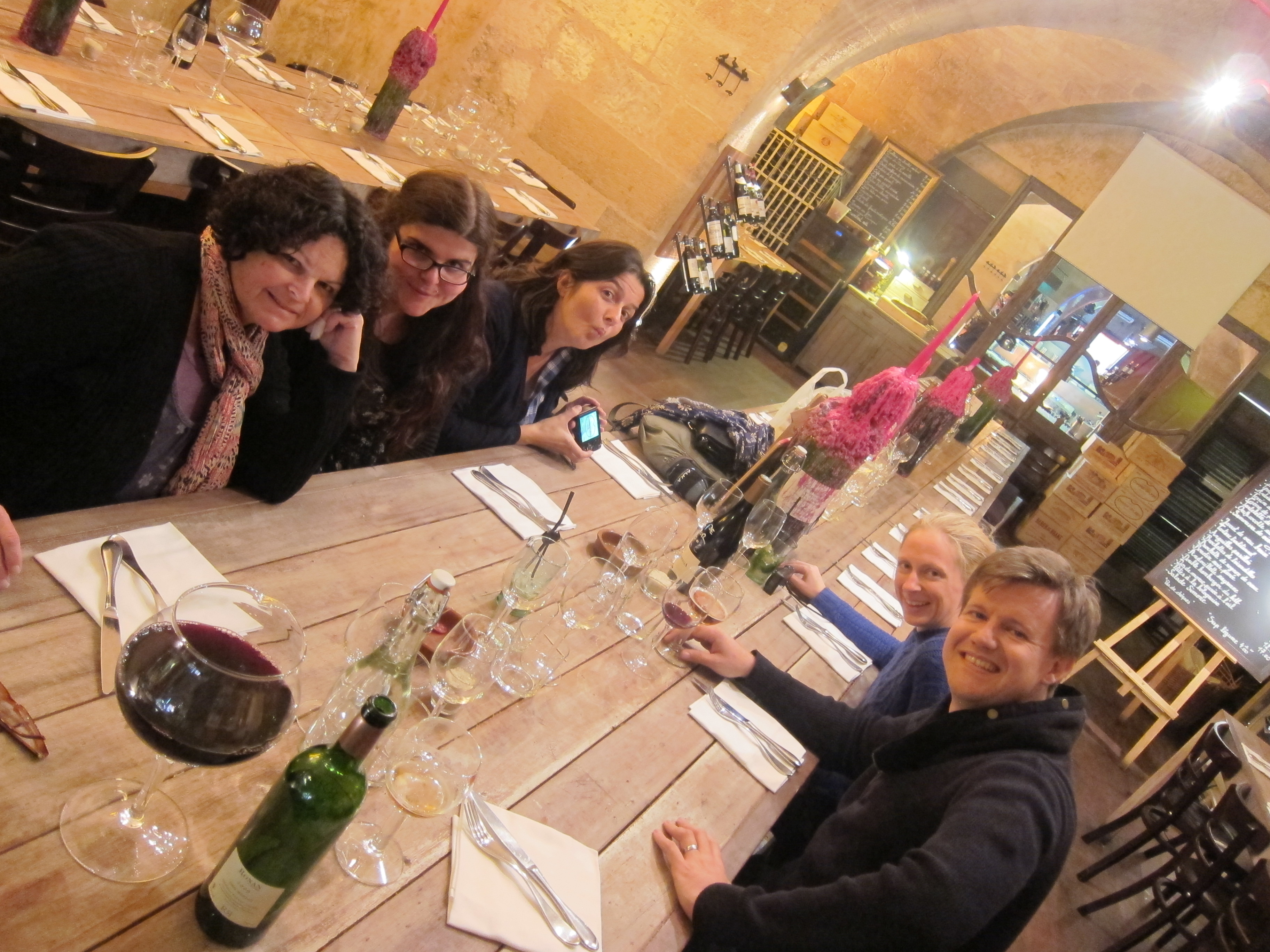 Bordeaux is a city on flat land with a large river called “la garonne” which has been used as a river port. It is not what I imagined! It is however very well laid out and clean and has a great , modern tram system. We caught one into the main, older part of the city and the shops and buildings were lovely. Got myself a backpack….finally conceded that my bag was too cumbersome for intrepid style travelling. However, everyone is so fond of the old elephant that Phil and Gina have adopted it to carry their shopping home in!! All tired and dying for fresh salad or vegetables but ended up in a funky bar for Mojito’s which were the best followed by a seafood dinner which was very adventurous. I stuck to the Sole but Kisane and Louise shared fish soup. langoustine, brown shrimp, whelks and other shellfish. Bordeaux red to accompany the meal of course…our french language skills are improving especially when deciphering menus.
