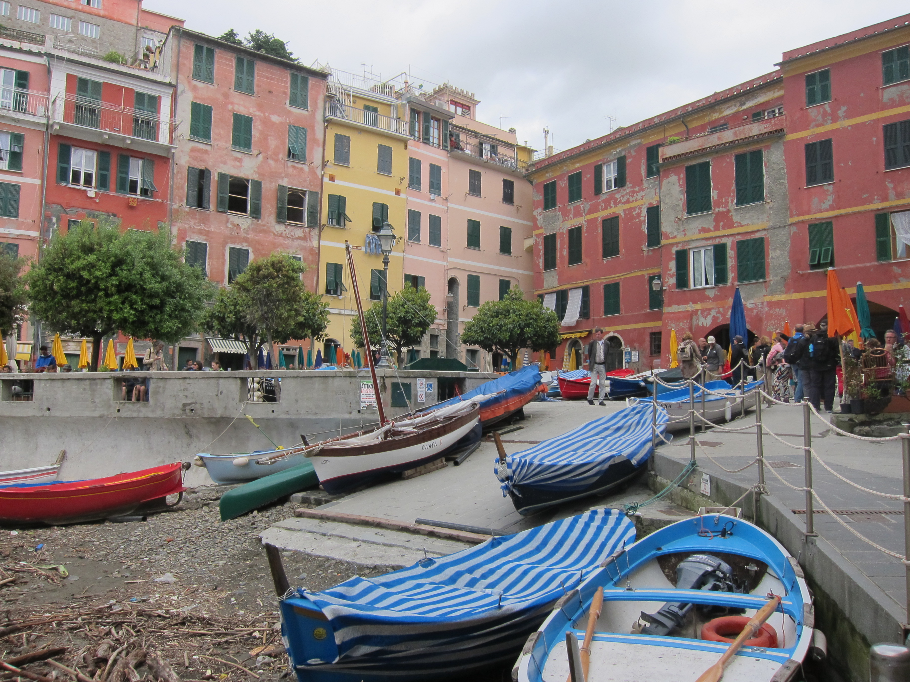 Took a local train from La Spezia to the famous and spectacular coast made up of steep and rugged cliffs dotted with five (cinque) villages. The train runs right along the edge of the coast but includes a lot of tunnels! We got off at the village of Manarola and took a local mini bus about two thirds of the way up the mountain and then hiked along a track through vineyards, olives, vegetable gardens and farmhouses finally descending at the village of Corniglia which was really pretty. After lunch we descended hundreds of stairs to catch the train again to explore Vernazza which is very picturesque with a small harbour. After sipping cafe macchiato and tasting Italian
