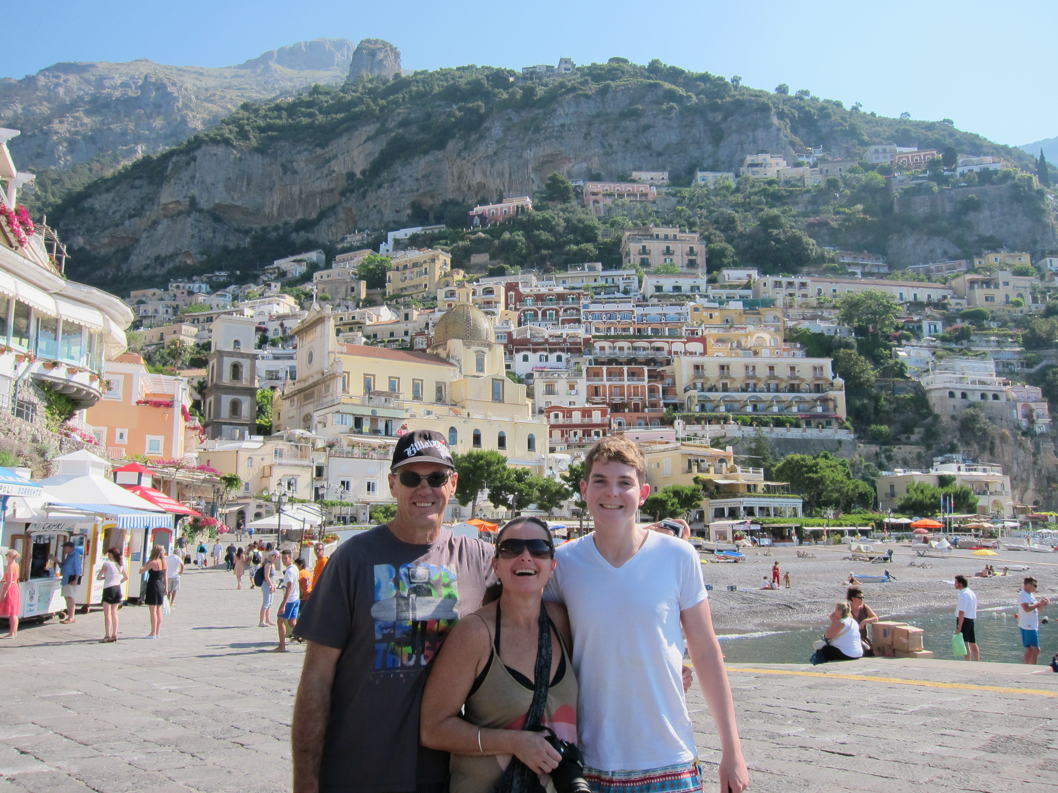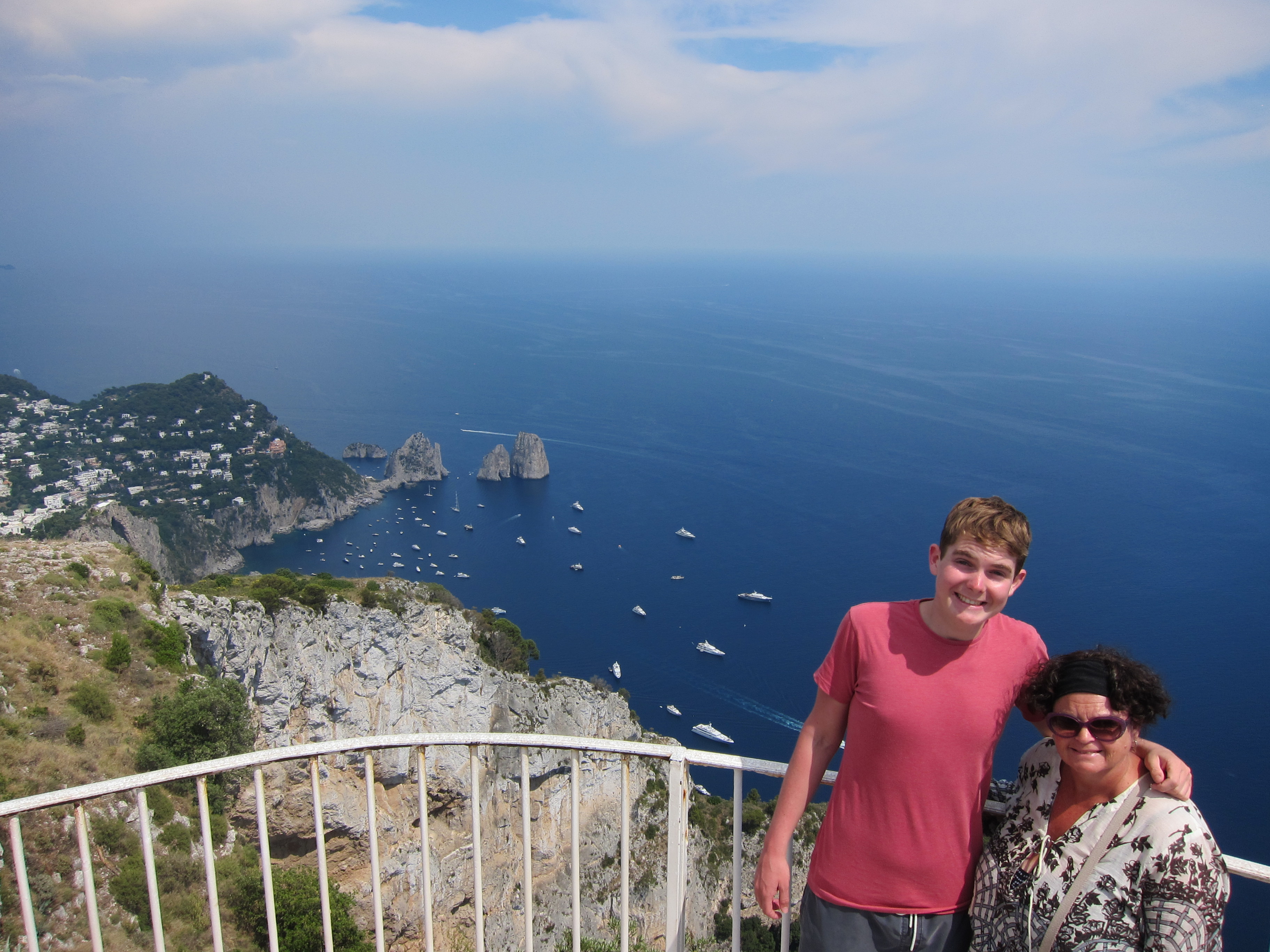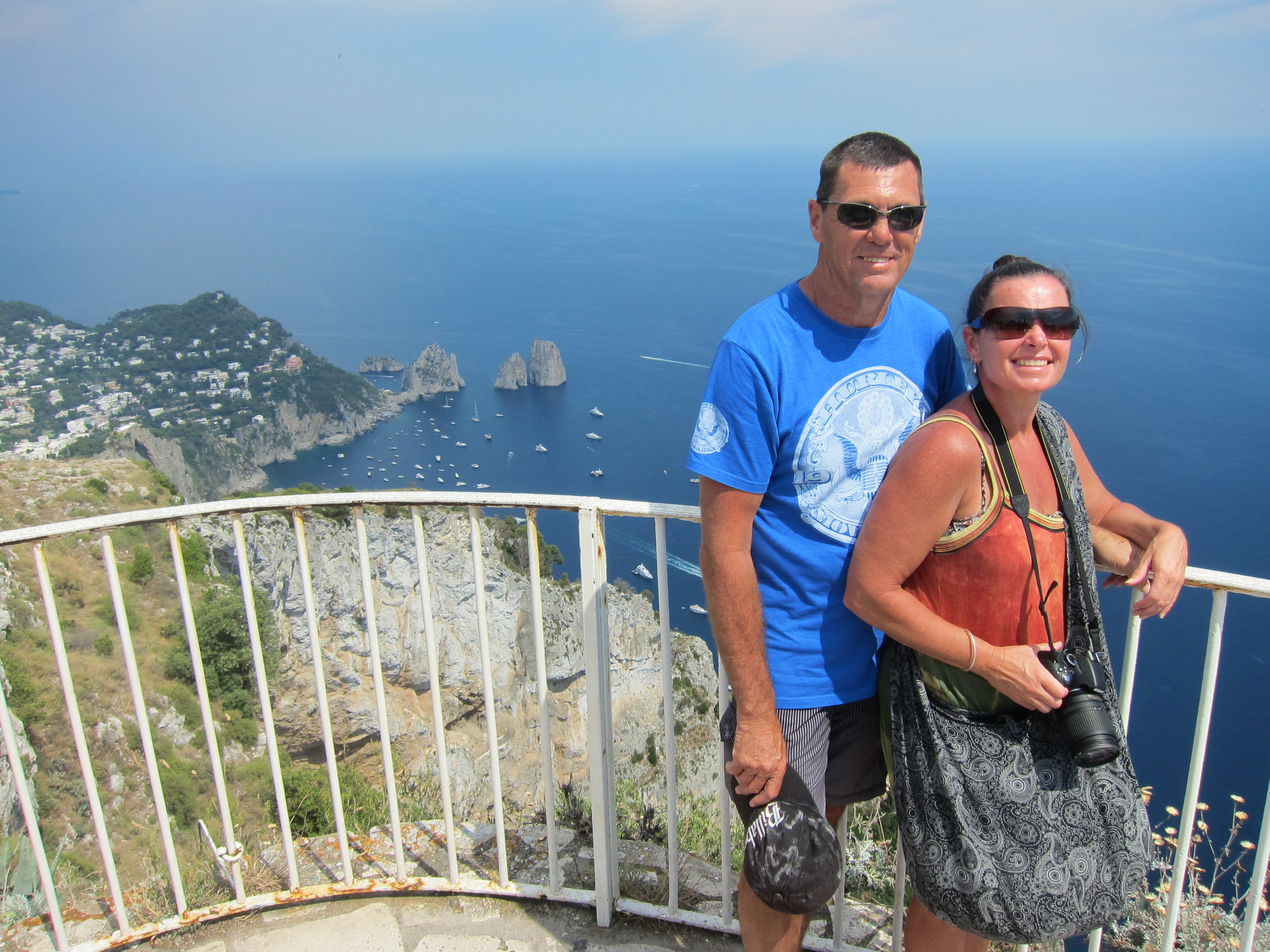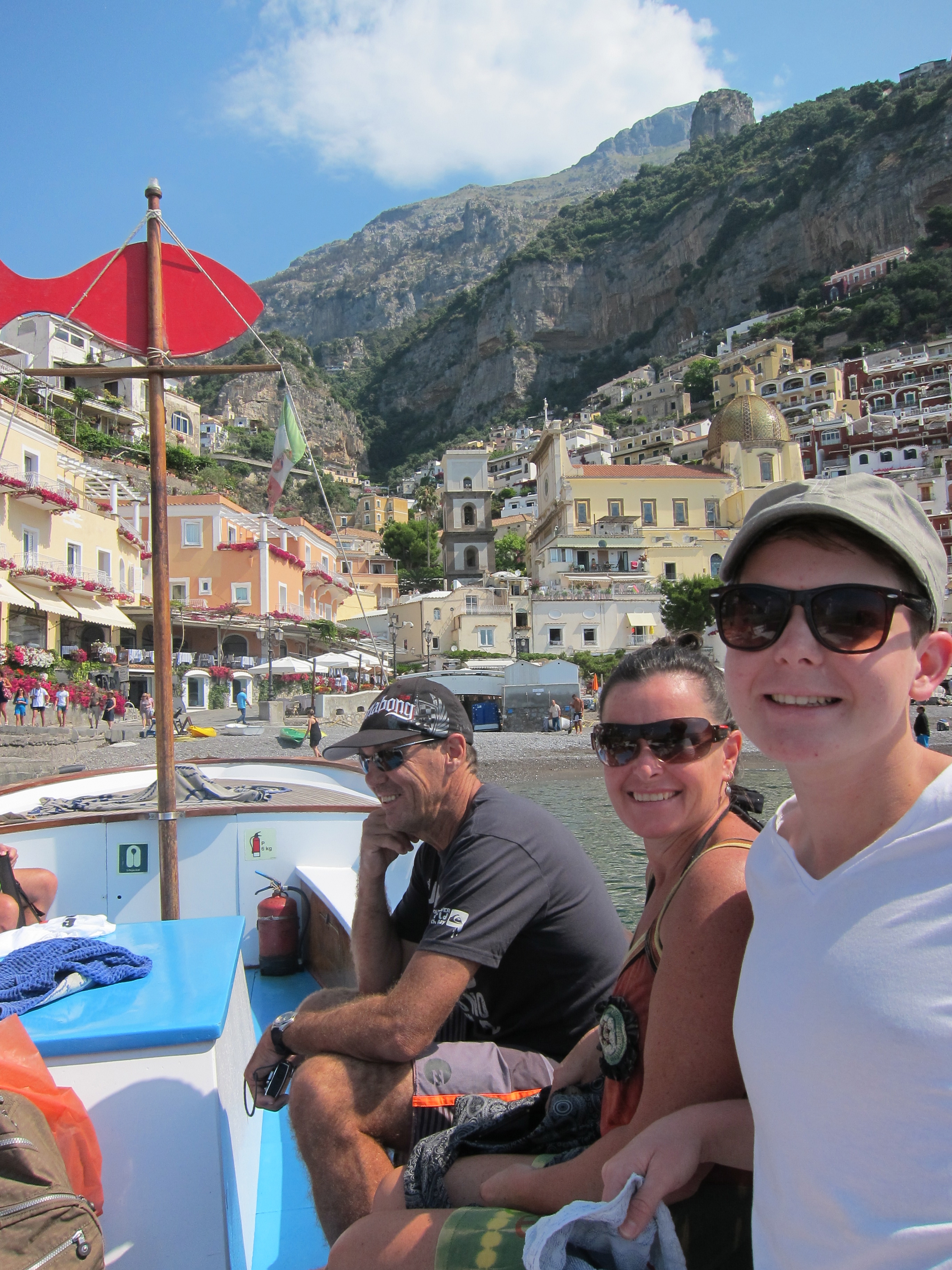 Took a trip to Capri on one of Gennaroe Salvatore’s (a long time local operator in Positano) boats the ‘Donna Assunta’and circumnavigated this beautiful Island…Grotto Bianca (the white grotto), Faraglioni rock formation, swimming near Marina piccolo, Grotta Verde (the green grotto) and Grotta Azzurra (the blue Grotto) which has loads of tourists waiting to be taken by the tiny row boats inside the cave which was short, expensive but unique and the irridescent blue of the water was just beautiful! Our boat dropped us at Marina Grande where we booked Luigi and his open topped taxi to take us around. Capri town was lovely and of course full of designer shops. Lunch at ? which had spectacular views over the Marina. We drove along the narrow, cliffside winding road to Ana capri and took the chair lift to Monte Solaro for an amazing perspective. The boat ride home to Positano was quite thrilling as a serious storm had hit and the swell was quite intense….weird weather in the Mediterranean!