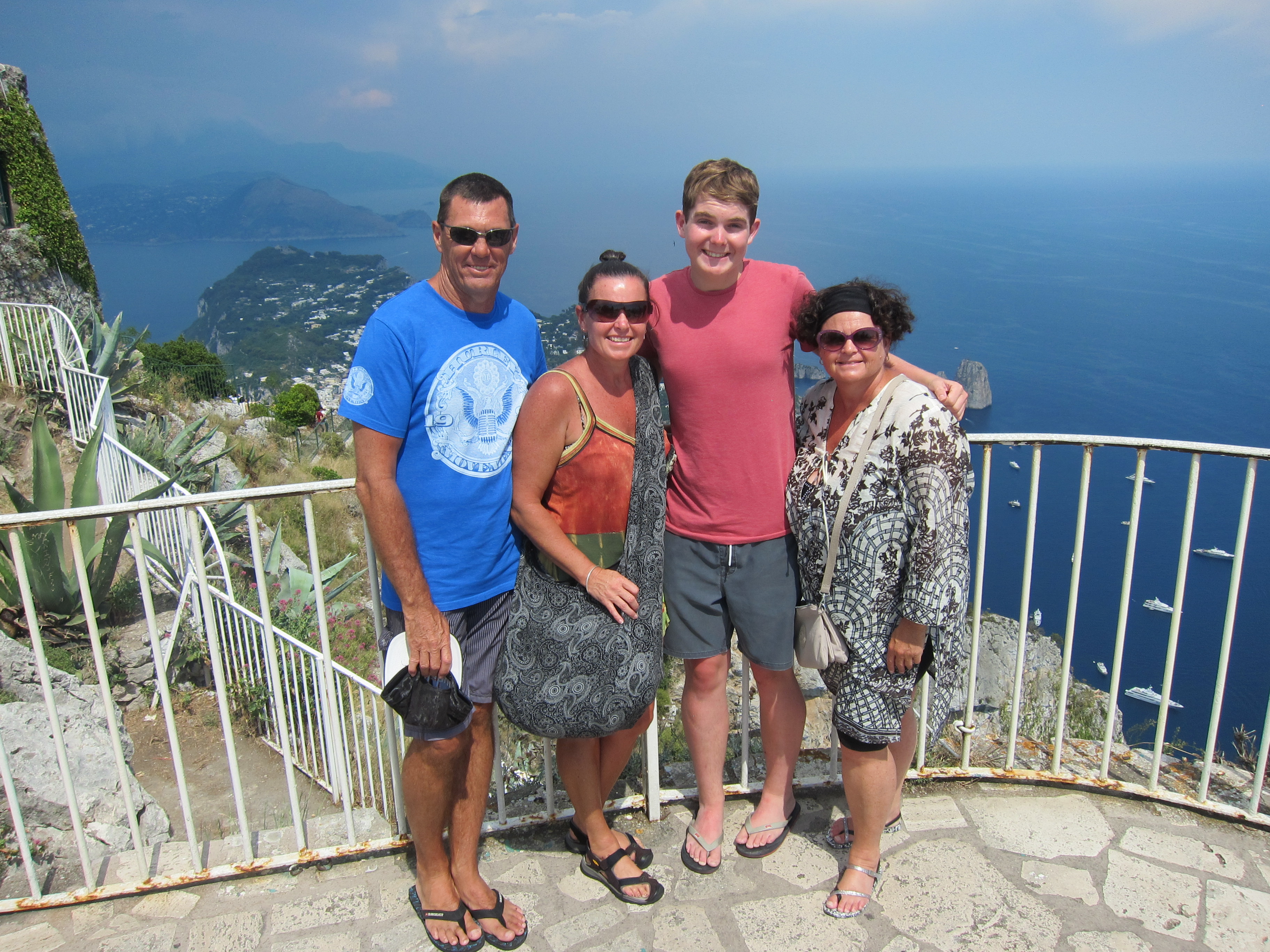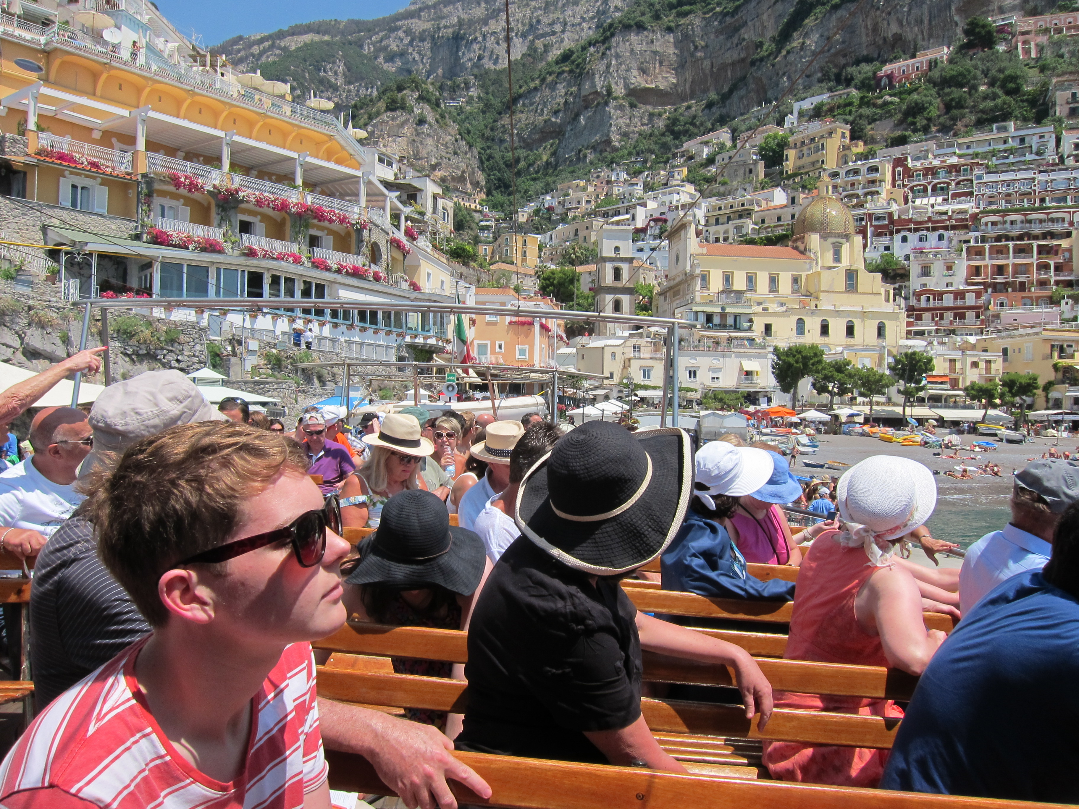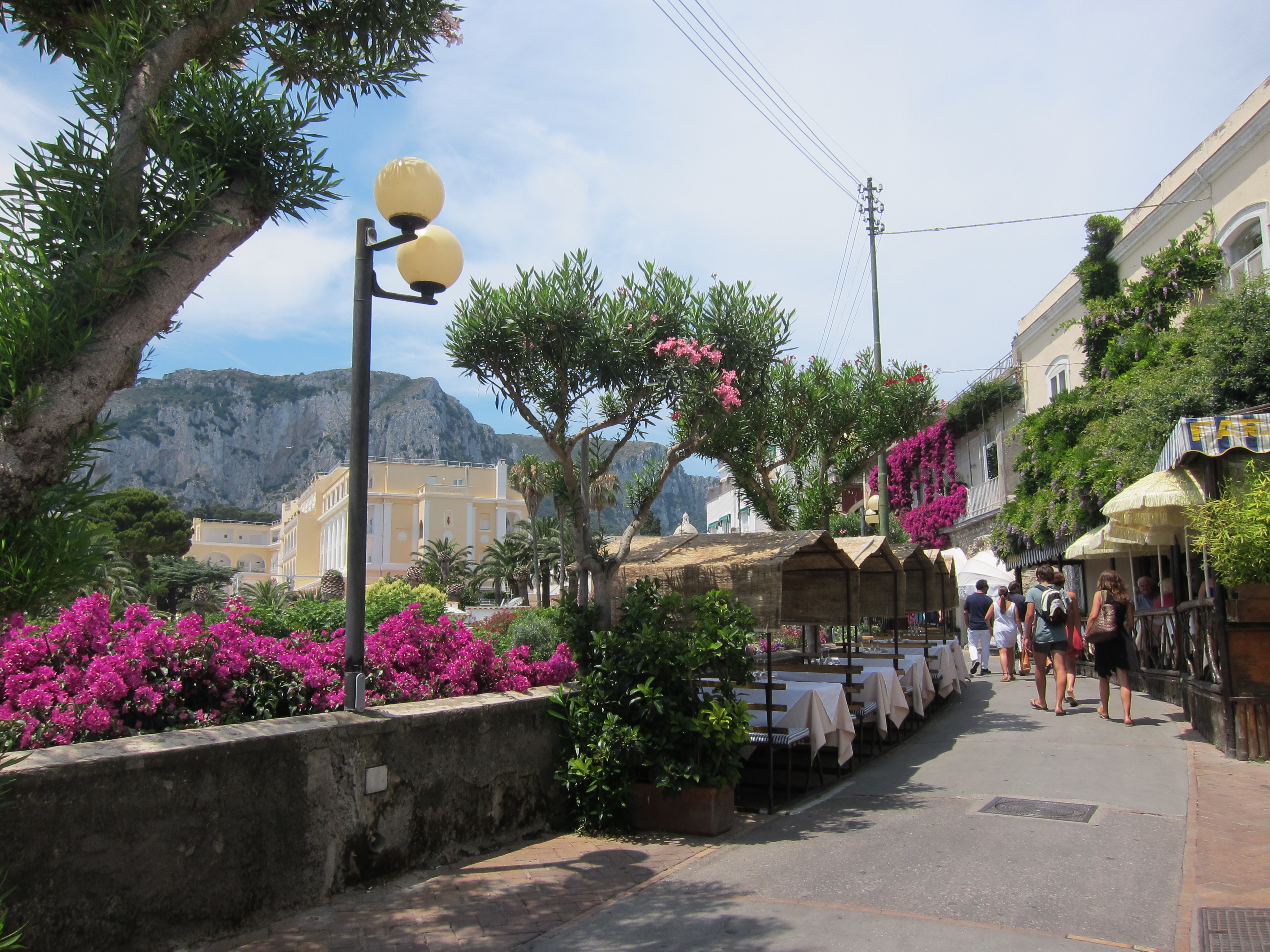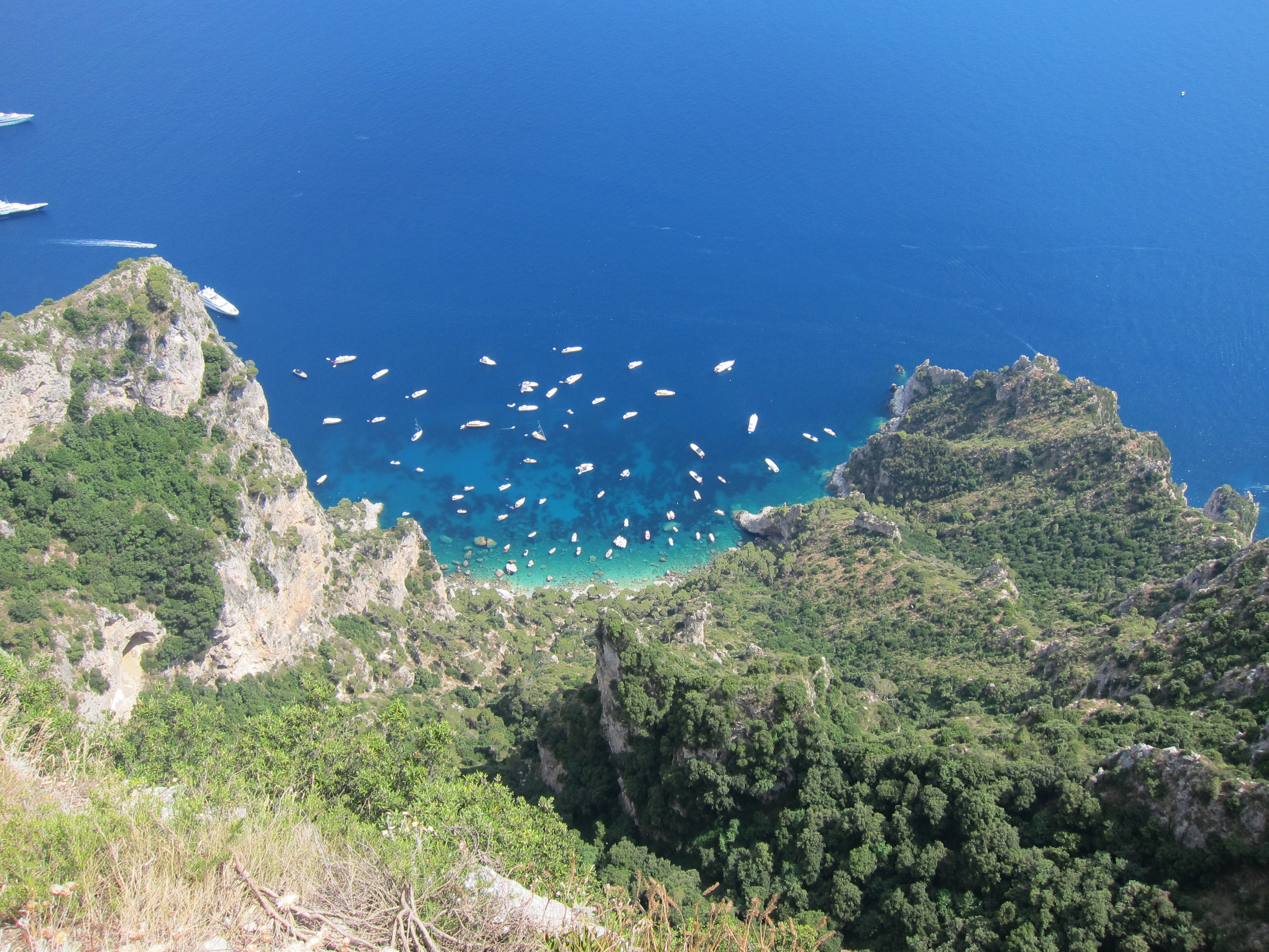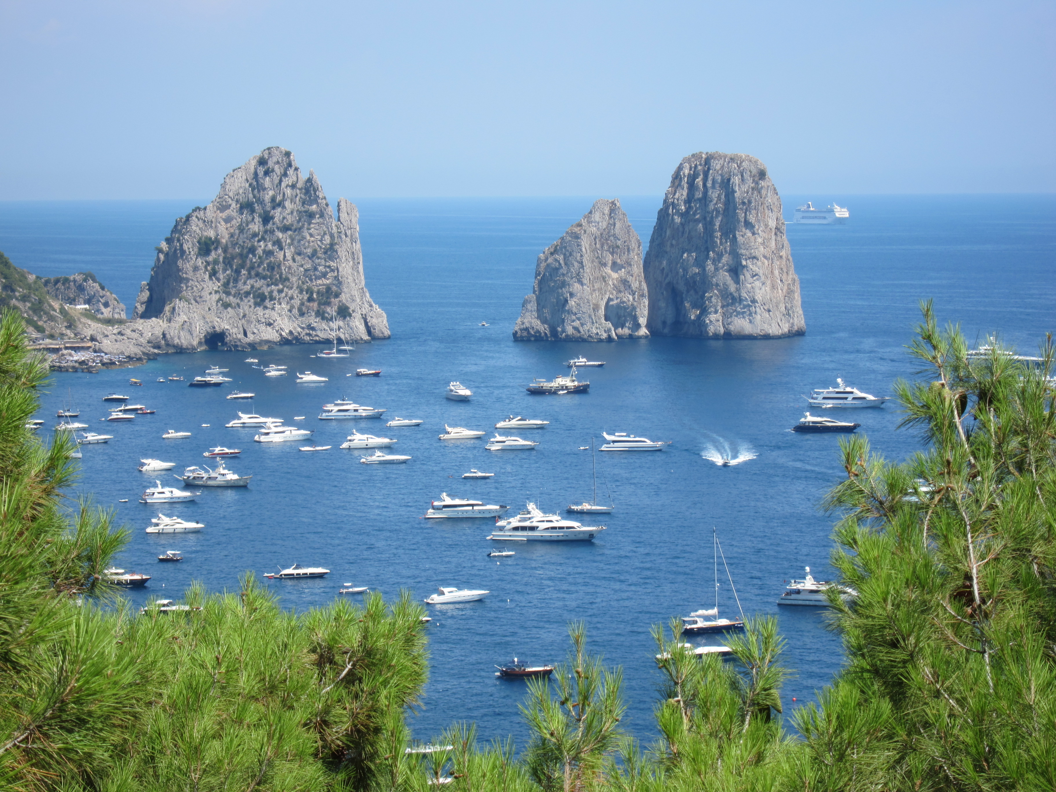Took a trip to Capri on one of Gennaroe Salvatore’s (a long time local operator in Positano) boats the ‘Donna Assunta’and circumnavigated this beautiful Island…Grotto Bianca (the white grotto), Faraglioni rock formation, swimming near Marina piccolo, Grotta Verde (the green grotto) and Grotta Azzurra (the blue Grotto) which has loads of tourists waiting to be taken by the tiny row boats inside the cave which was short, expensive but unique and the irridescent blue of the water was just beautiful! Our boat dropped us at Marina Grande where we booked Luigi and his open topped taxi to take us around. Capri town was lovely and of course full of designer shops. Lunch at ? which had spectacular views over the Marina. We drove along the narrow, cliffside winding road to Ana capri and took the chair lift to Monte Solaro for an amazing perspective. The boat ride home to Positano was quite thrilling as a serious storm had hit and the swell was quite intense….weird weather in the Mediterranean!