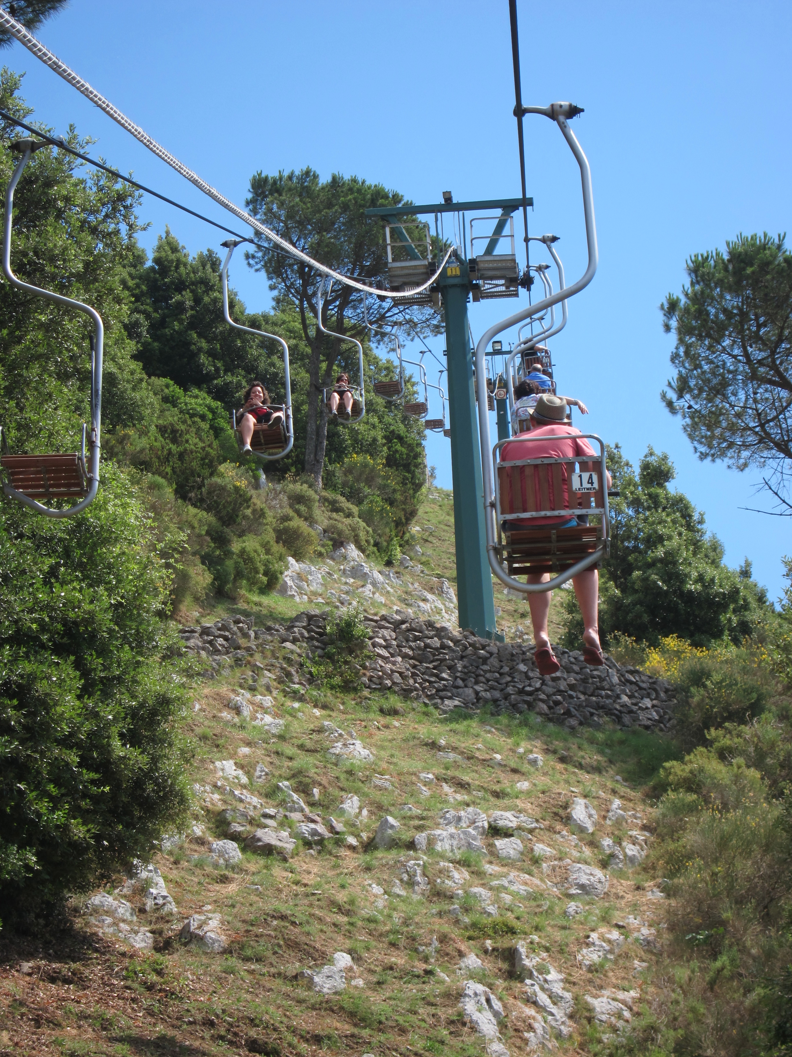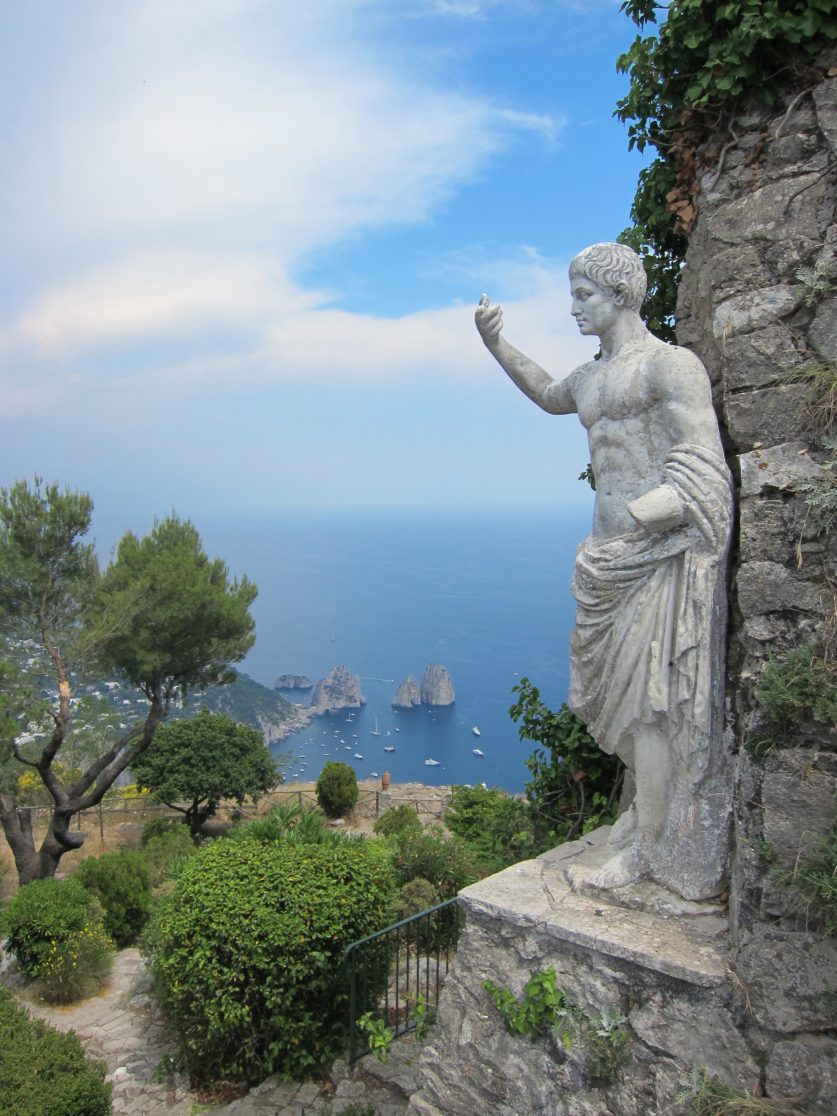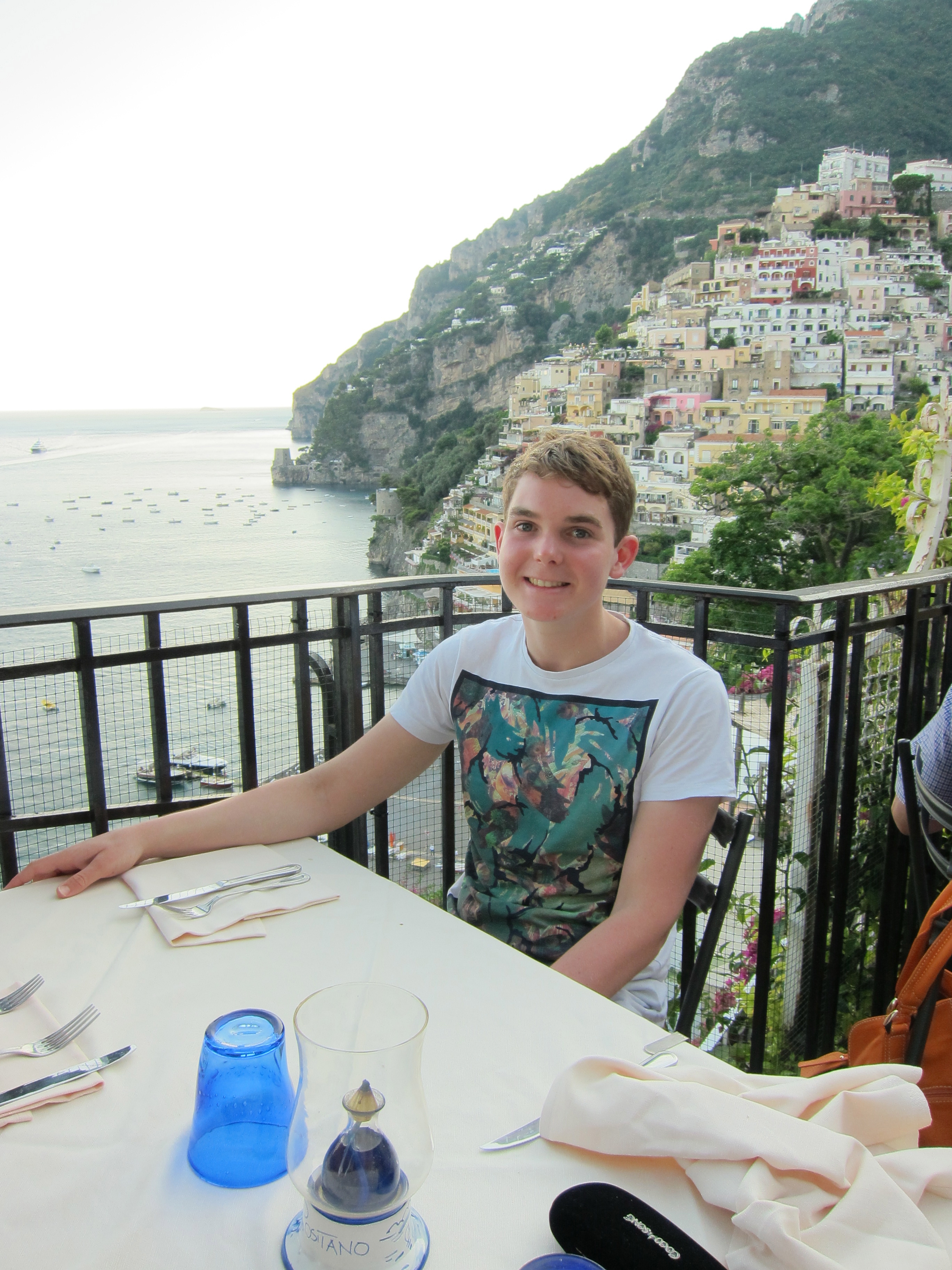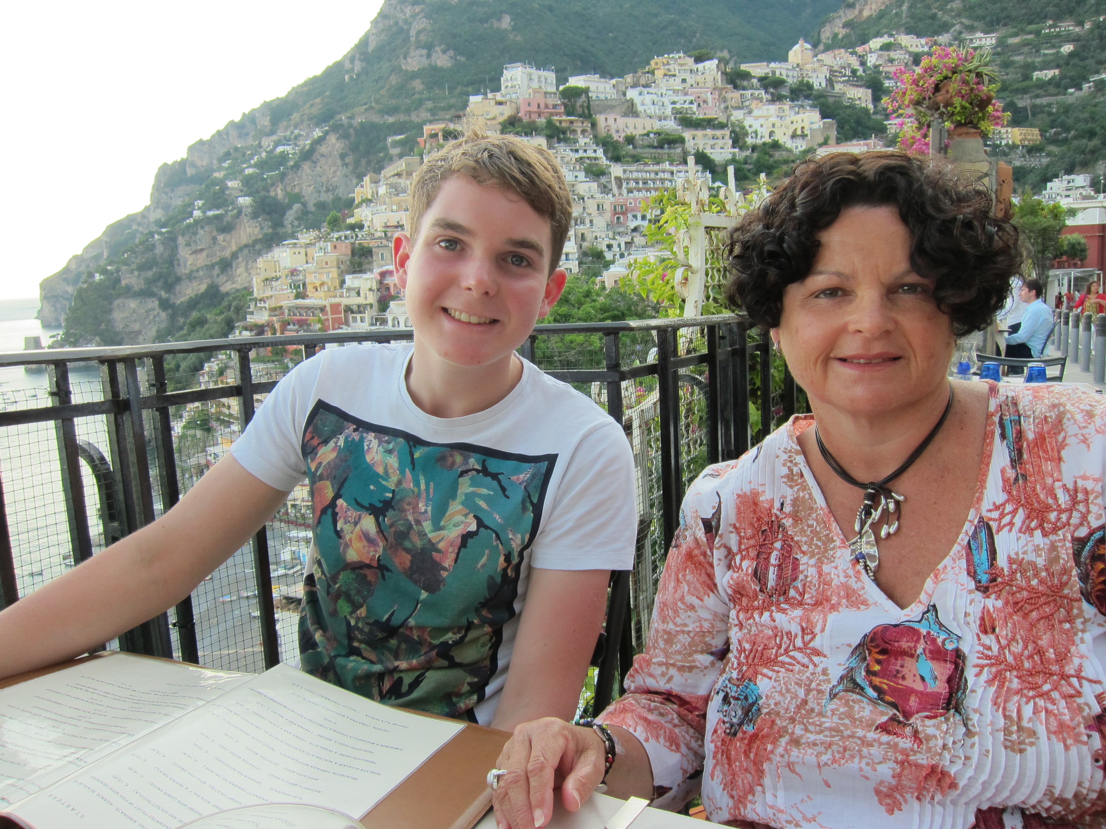Took a trip to Capri on one of Gennaroe Salvatore’s (a long time local operator in Positano) boats the ‘Donna Assunta’and circumnavigated this beautiful Island…Grotto Bianca (the white grotto), Faraglioni rock formation, swimming near Marina piccolo, Grotta Verde (the green grotto) and Grotta Azzurra (the blue Grotto) which has loads of tourists waiting to be taken by the tiny row boats inside the cave which was short, expensive but unique and the irridescent blue of the water was just beautiful! Our boat dropped us at Marina Grande where we booked Luigi and his open topped taxi to take us around. Capri town was lovely and of course full of designer shops. Lunch at ? which had spectacular views over the Marina. We drove along the narrow, cliffside winding road to Ana capri and took the chair lift to Monte Solaro for an amazing perspective. The boat ride home to Positano was quite thrilling as a serious storm had hit and the swell was quite intense….weird weather in the Mediterranean!