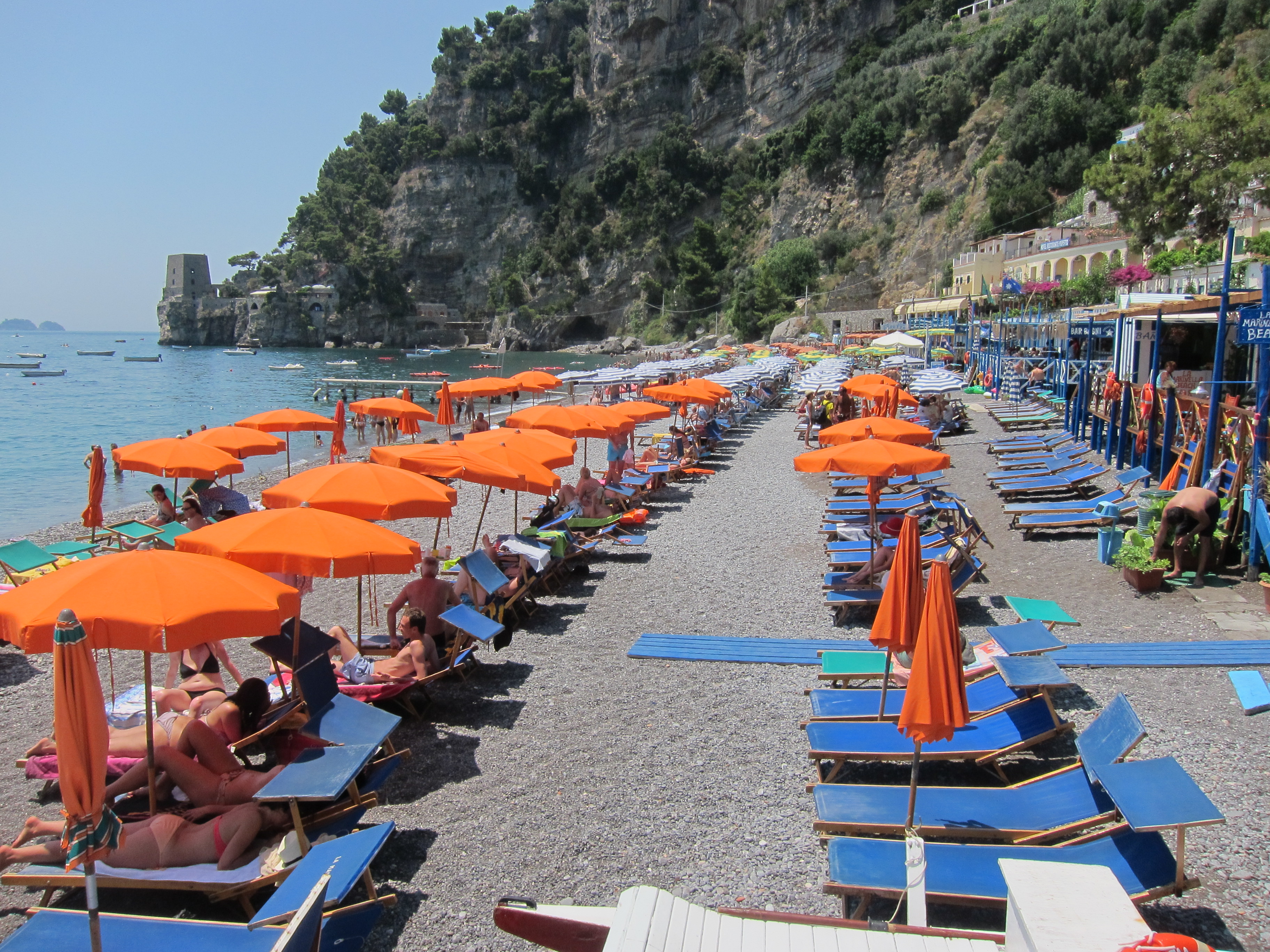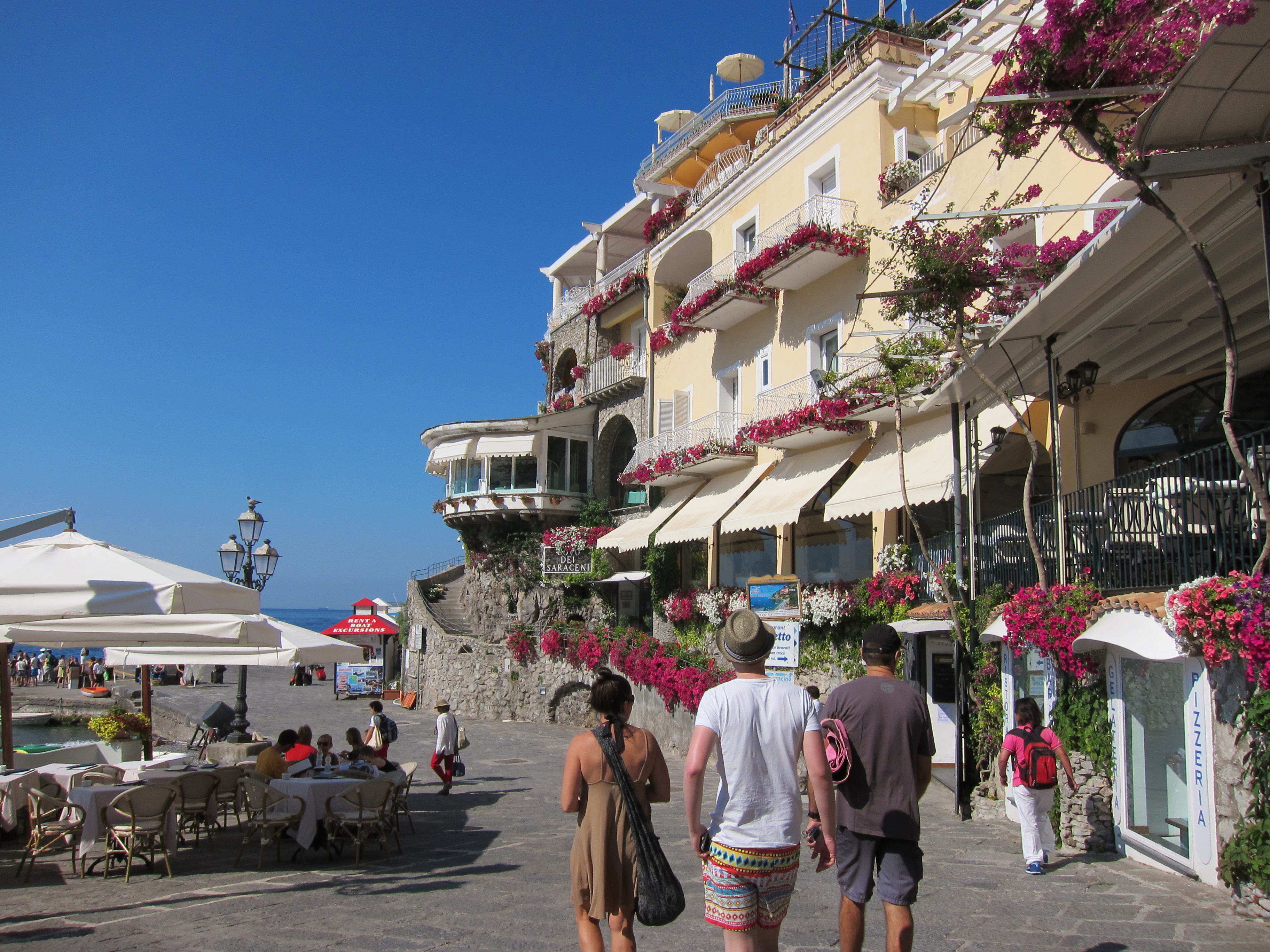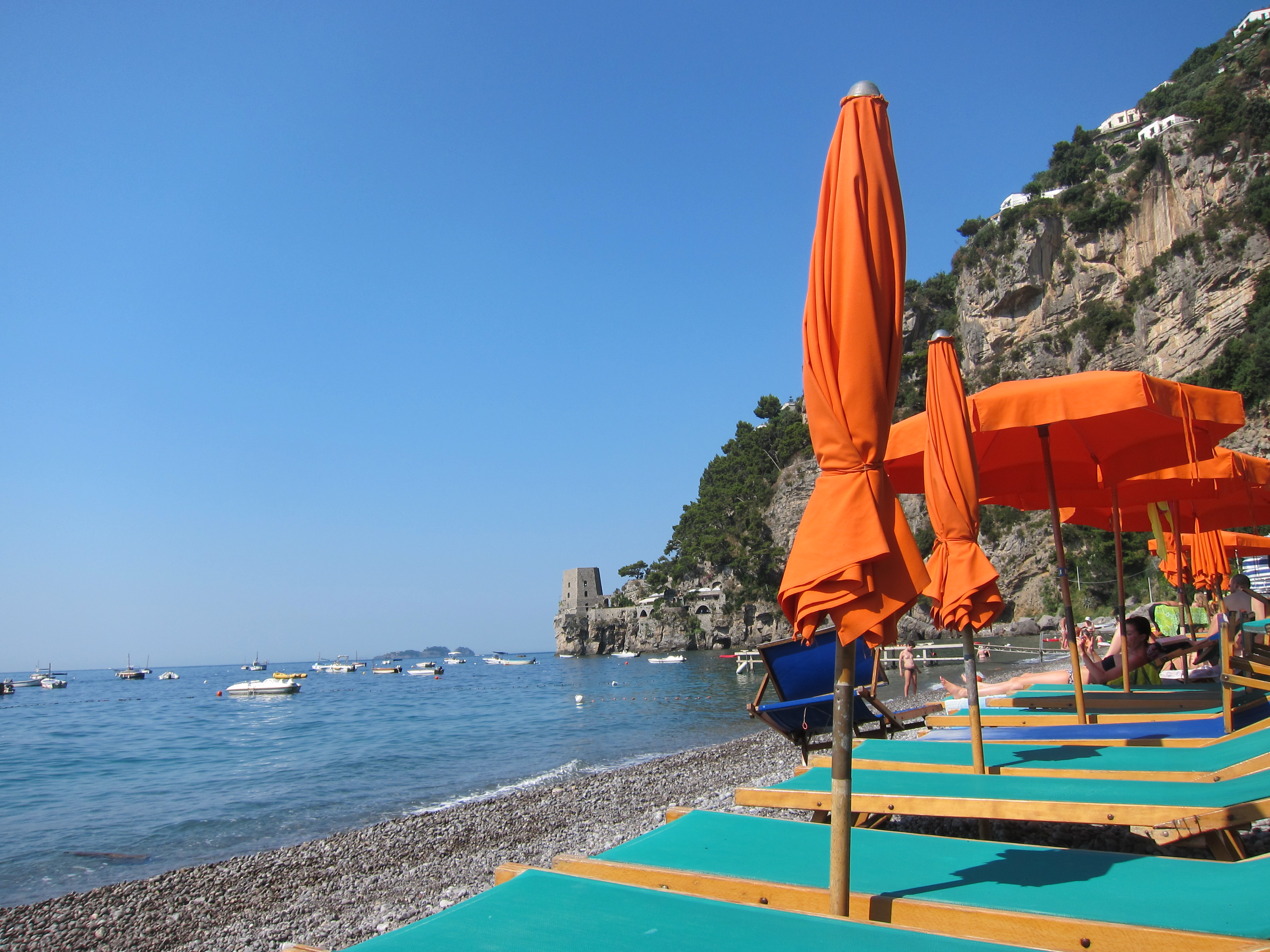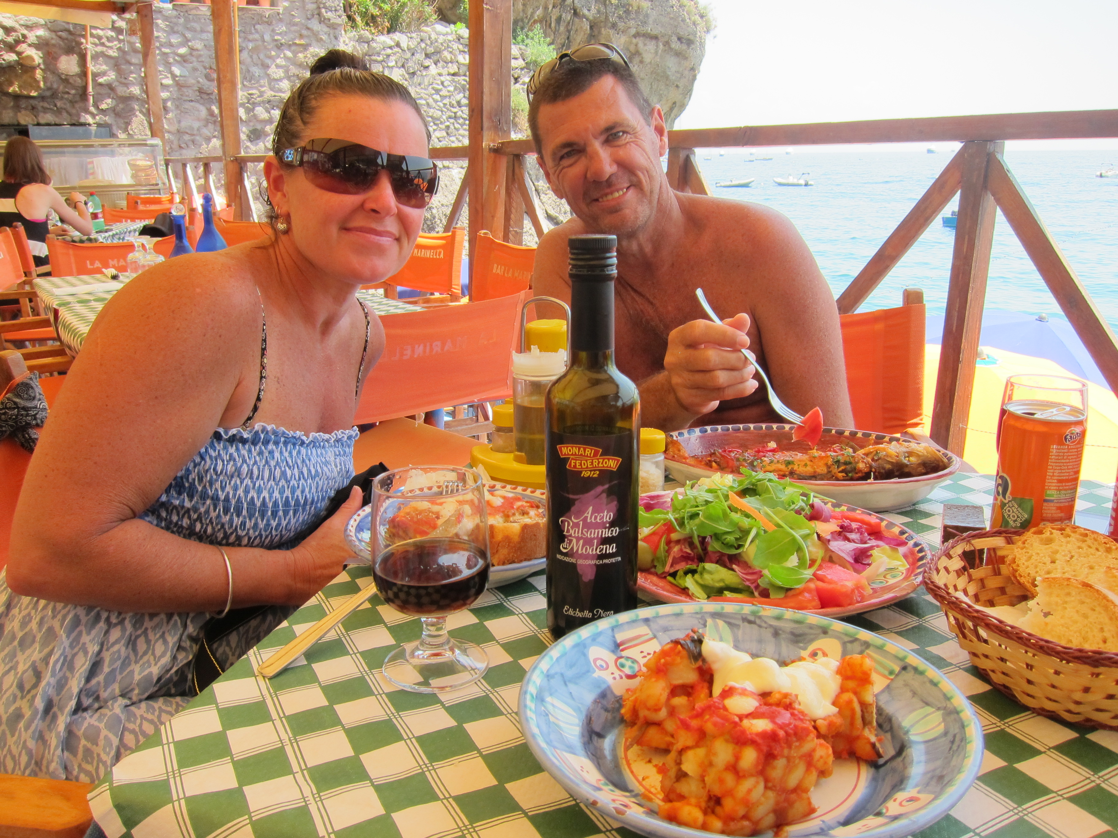 Hired our sun lounges and settled in at La Marinara for some serious relaxing and swimming! This beach has four bar/restaurants with their designated swimming and beach areas. Had lunch on the deck looking out over the bay. Came back for dinner at the family owned and run Ristorante Il Quarracinno overlooking Fornillo beach…fresh fish, pizza and lovely ceramic jugs of vino rosso!