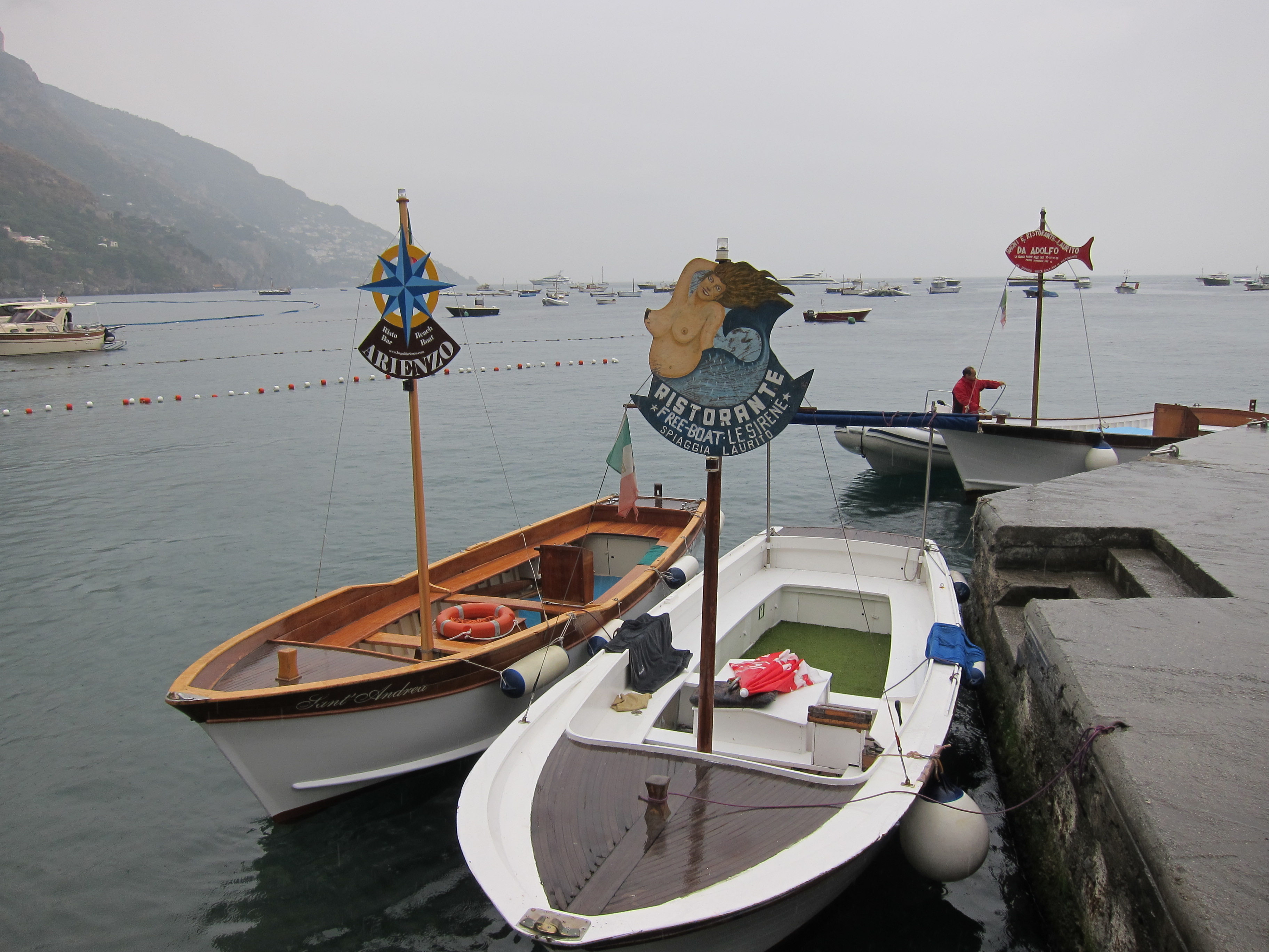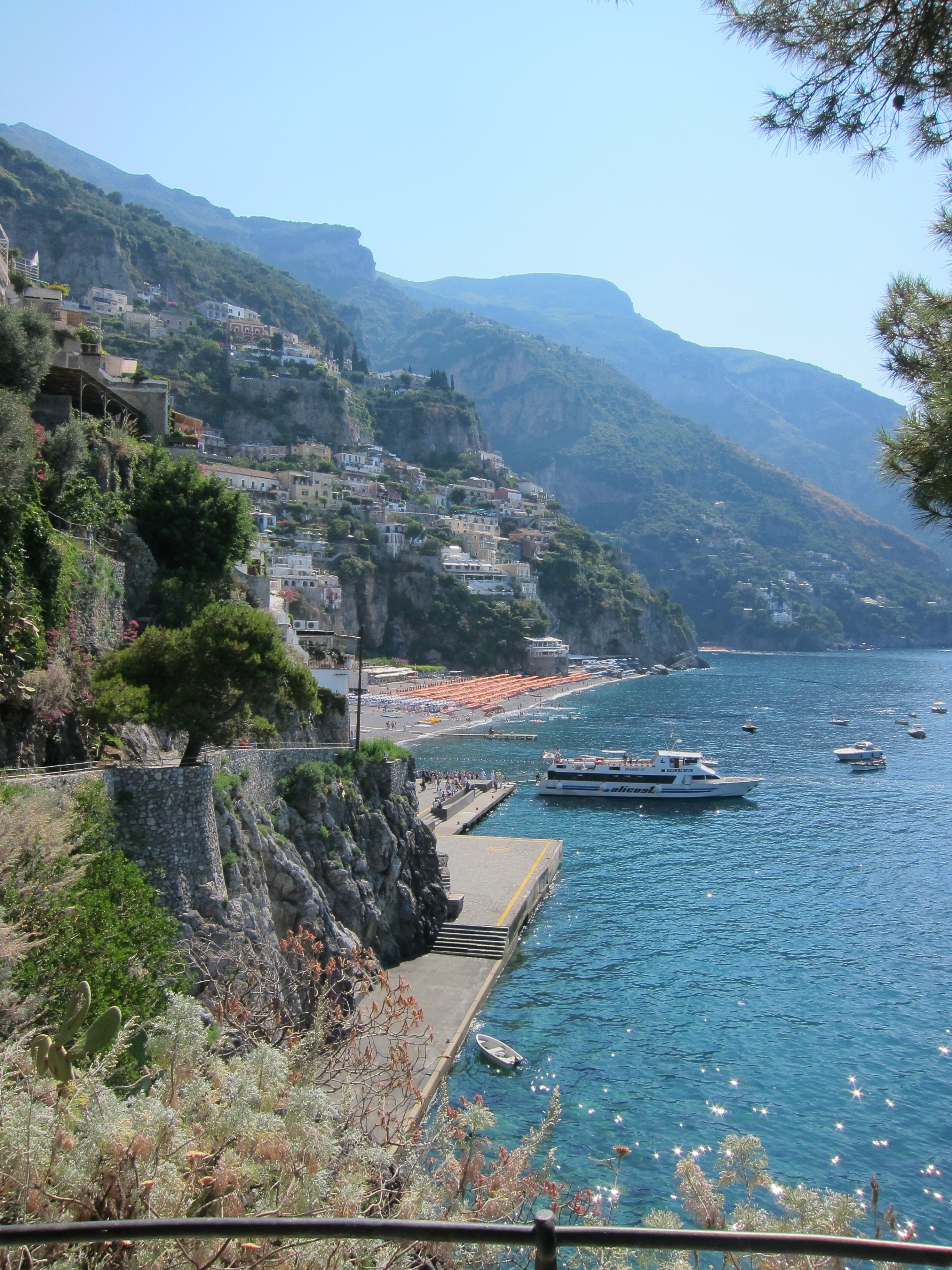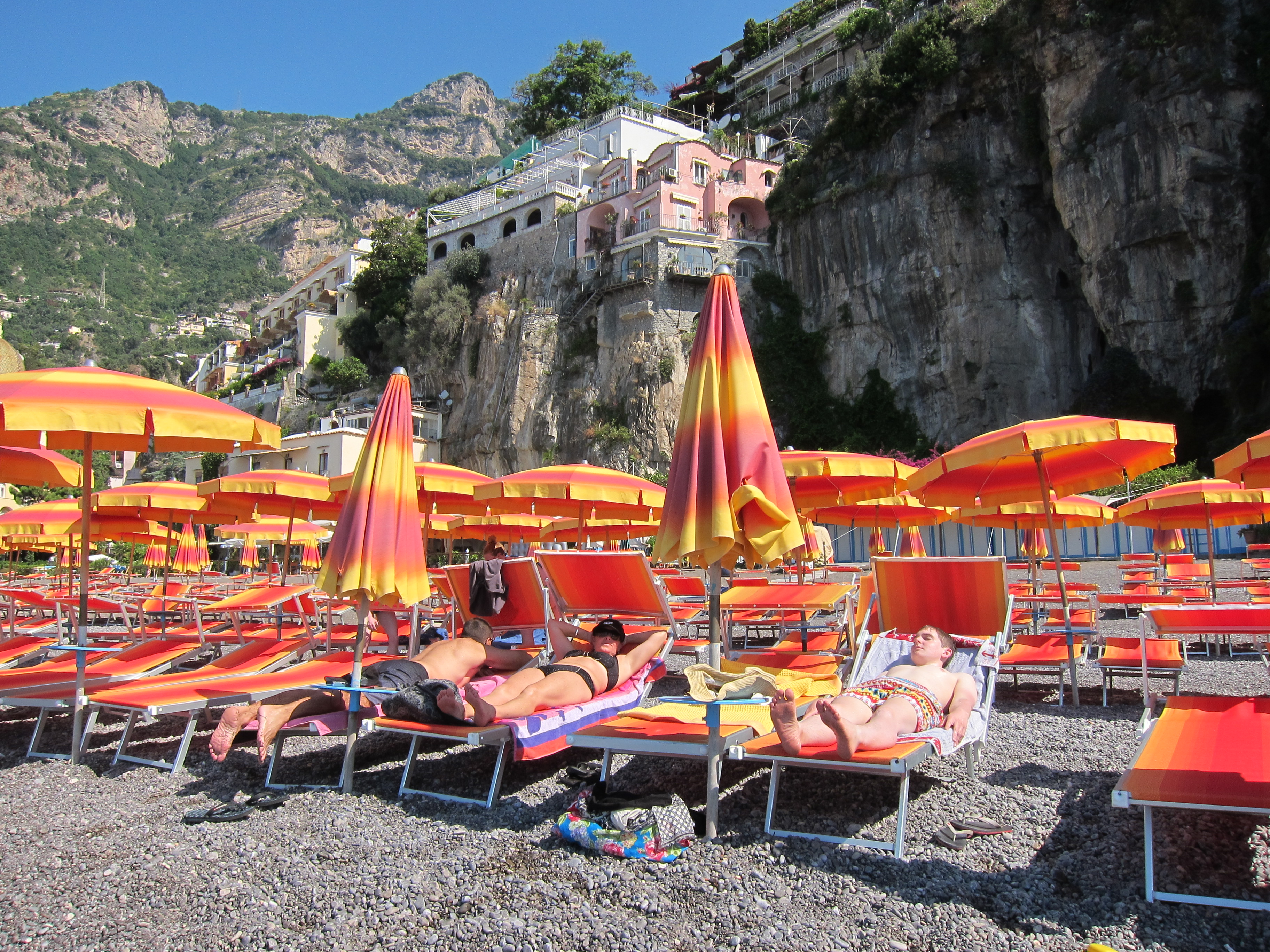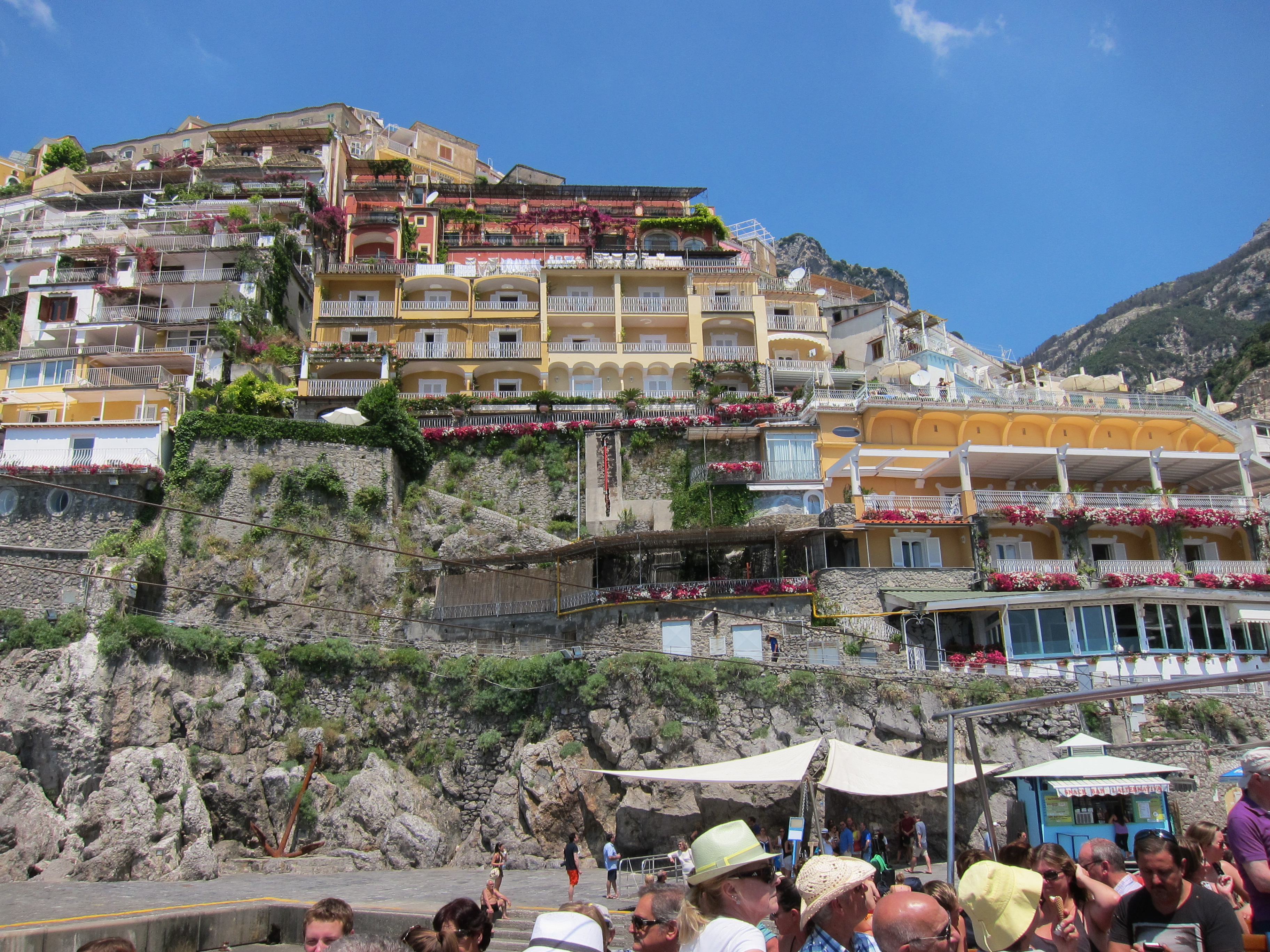 Hired our sun lounges and settled in at La Marinara for some serious relaxing and swimming! This beach has four bar/restaurants with their designated swimming and beach areas. Had lunch on the deck looking out over the bay. Came back for dinner at the family owned and run Ristorante Il Quarracinno overlooking Fornillo beach…fresh fish, pizza and lovely ceramic jugs of vino rosso!