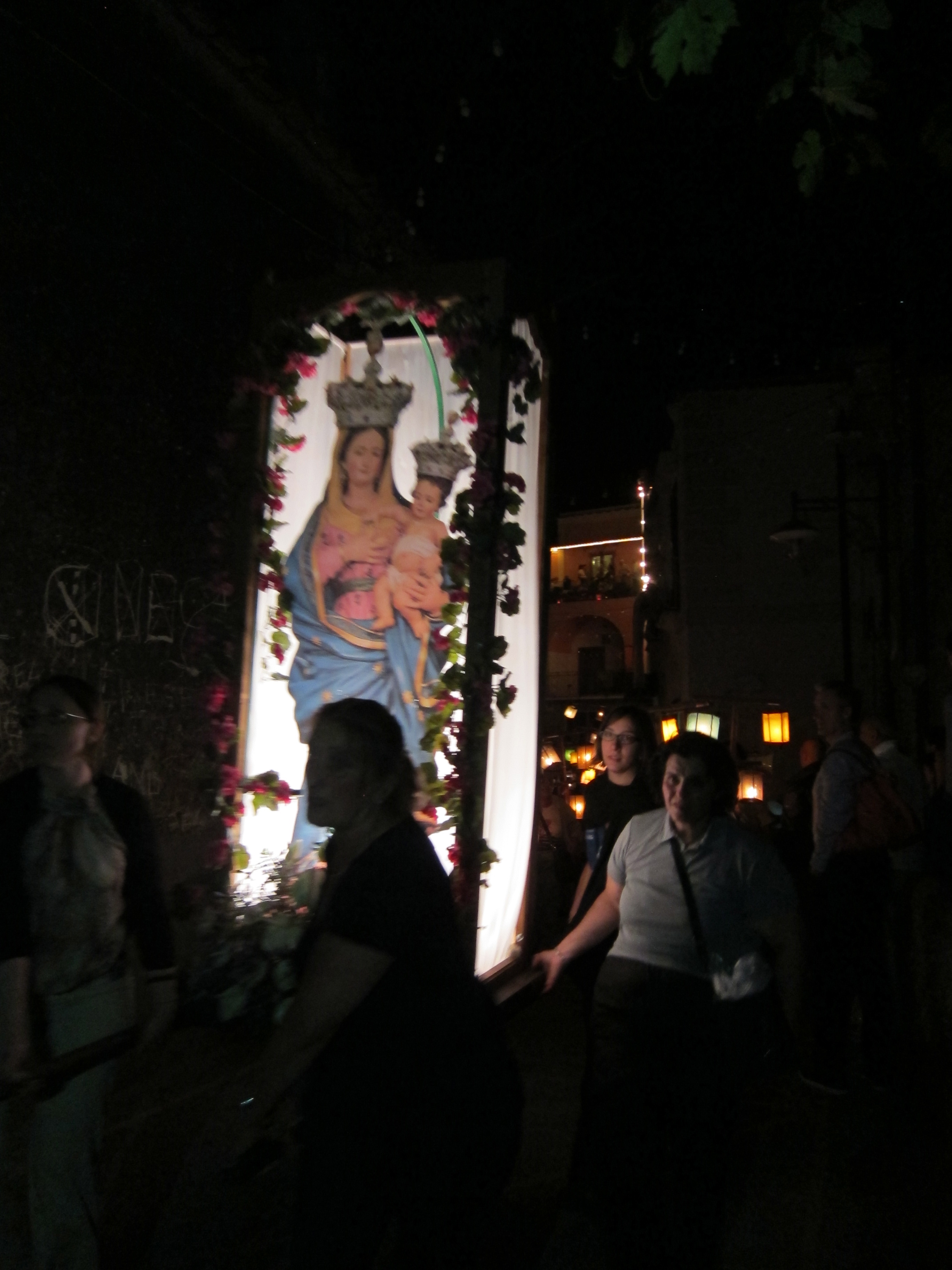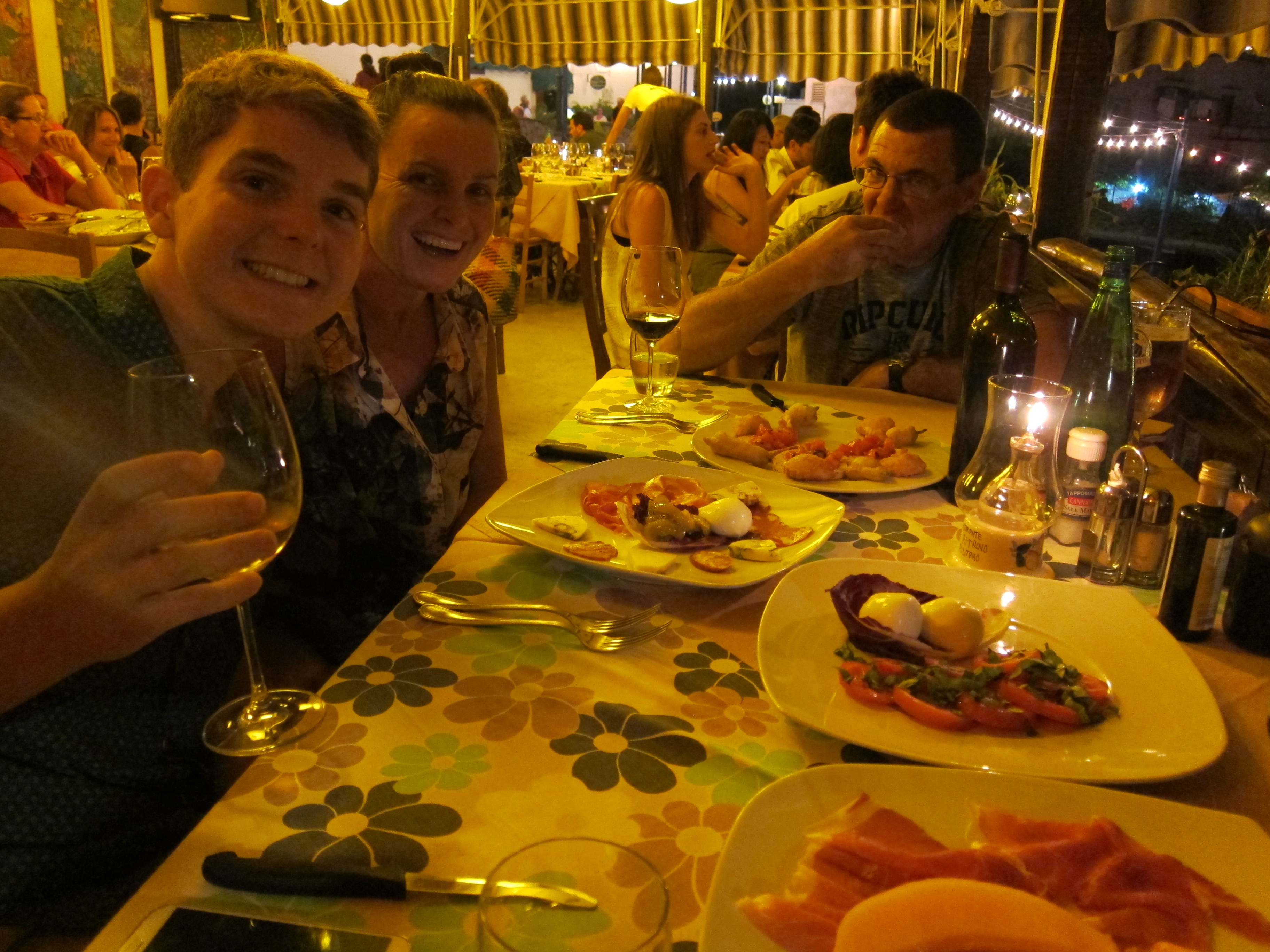 Leigh and Shane arrived after a gruelling 38 hour point to point journey for antipasto and Italian beers…Had some sleep then hit the main beach in Positano, Marina Grande for some serious swimming and sun baking followed by Italian meats, cheeses, olives, salad and fruit for lunch. The brave and fit explored Positano before an Aperol Aperitivo on our terrace and a taxi trip to the village of Montepertuso high up the mountain behind Positano. We had dinner at Il Ritrovo and joined in with the village’s annual festival honouring the Patron Saint Madonna St maria delle Grazie. It was amazing with fireworks going off all day culminating in a very solemn display where the town lights were turned off and a lighting and fireworks display depicting the battle between the Devil and the Saint prevailed up on the actual mountain side. It was truly an amazing and spectacular cultural experience at midnight with mainly locals in attendance which was just fantastic. Managed to organise a taxi back down the mountain…logistical nightmare!