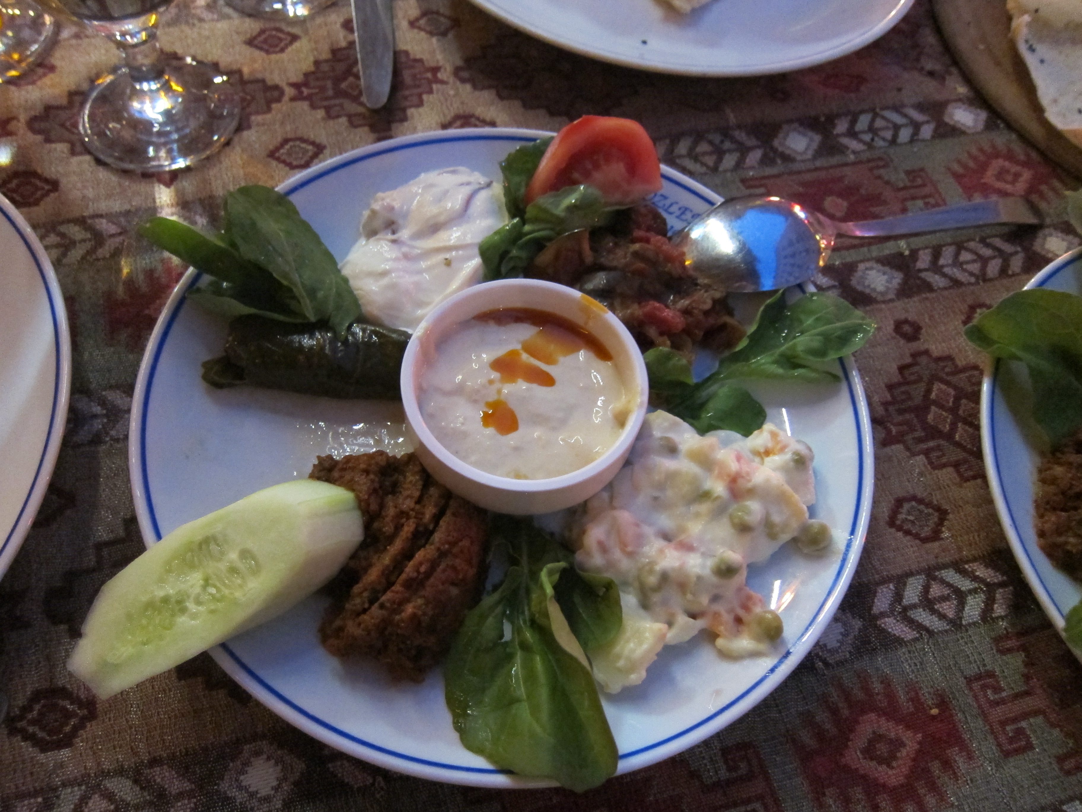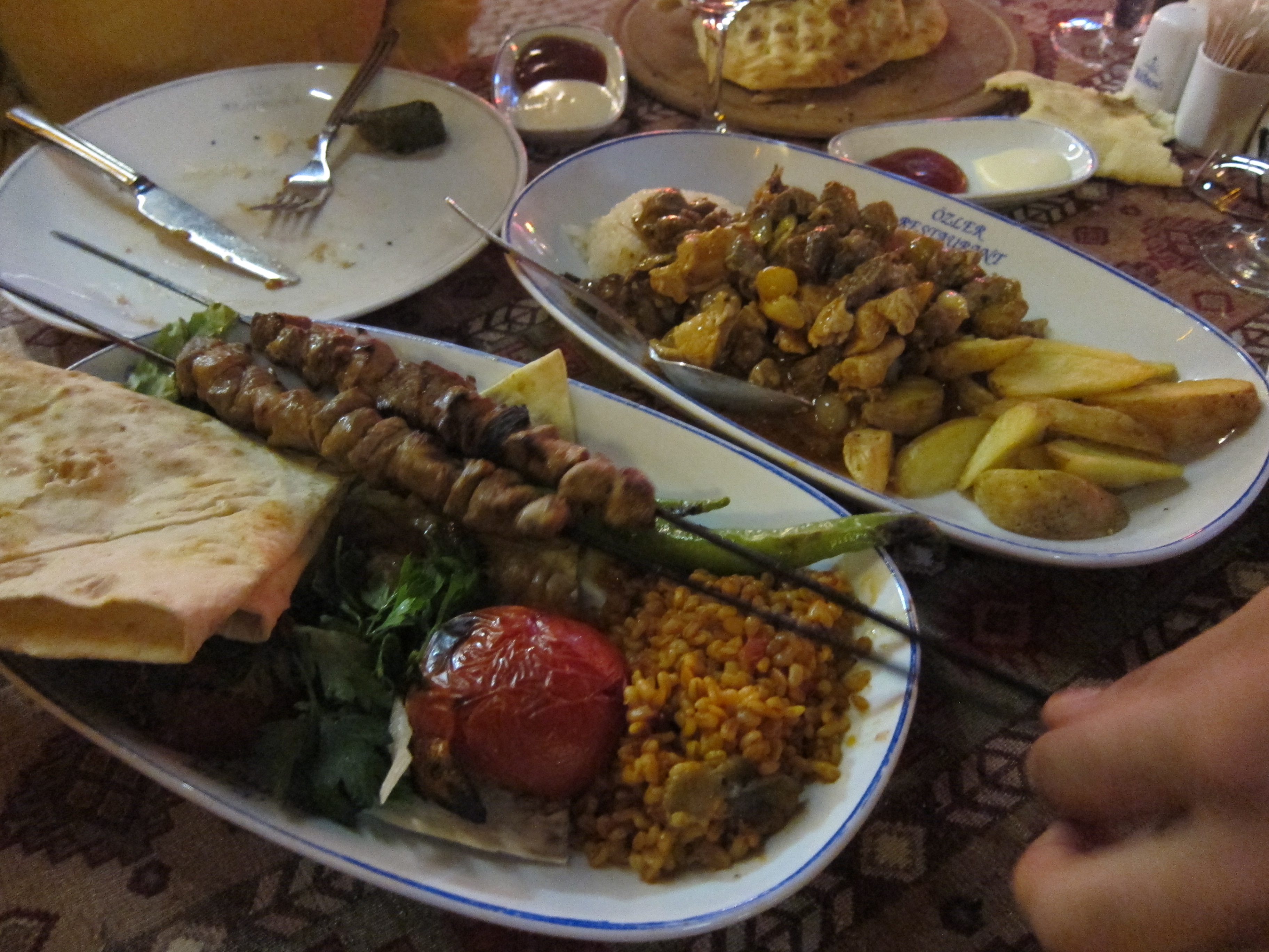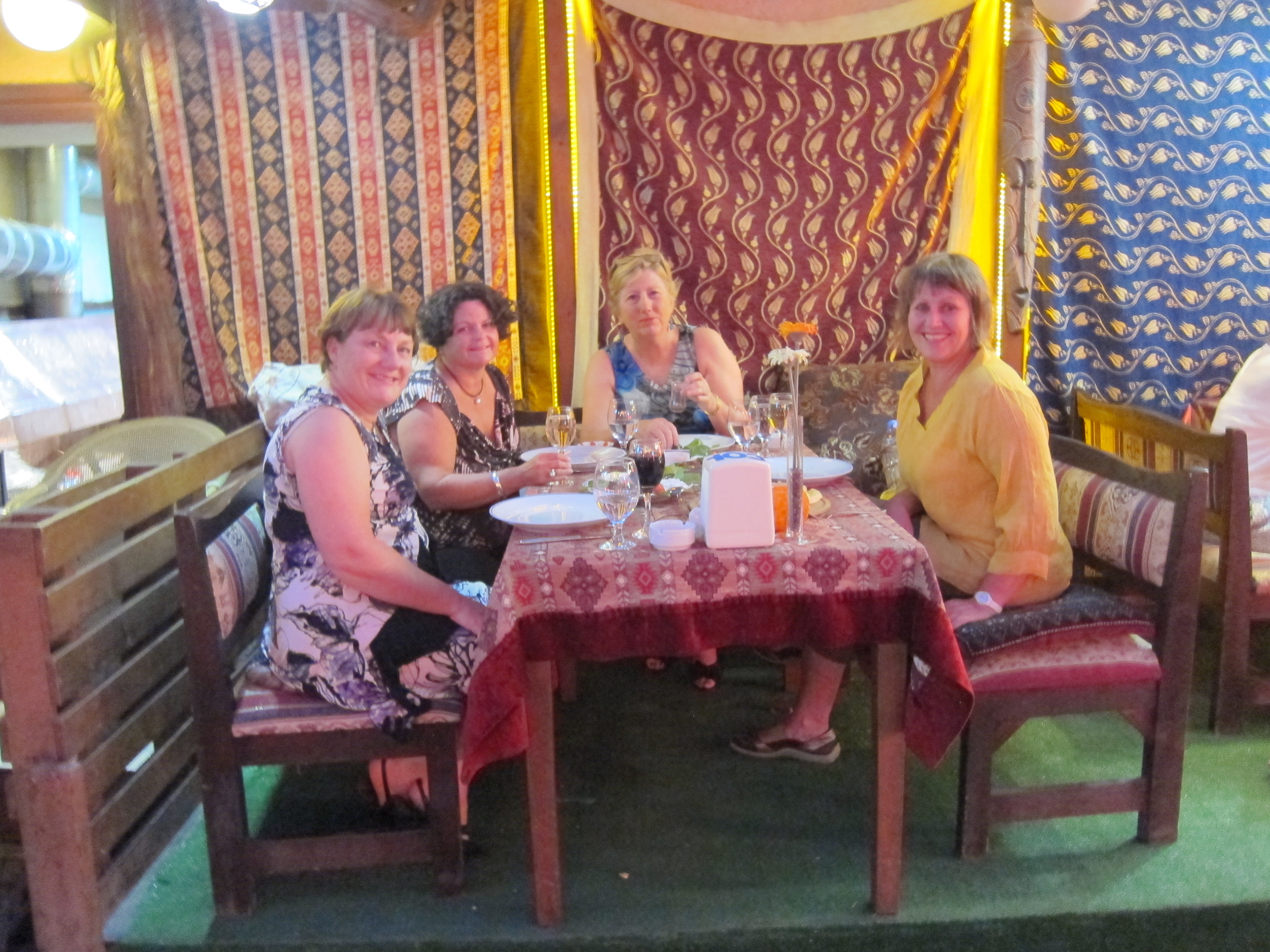 Flew British Airways to Ataturk International airport in Istanbul, Turkey. Transferred to Hotel Prince which is the joining point for the Peregrine Tour. It was the end of Ramadan so everyone was out celebrating with picnics in the parks near the waterfront cooking shish kebab on tiny barbecues! The city is flanked by the Sea of Marmara which was filled with tanker ships of all description. The city is in a dry, barren landscape but vast and dotted with so many high-rise apartment blocks. The old walled city of course was immediately fascinating with stone streets and interesting shops and restaurants. The Hotel is somewhat above the ‘intrepid tour’ standard so a nice surprise! I met up with friends Joanne and Chris from Port Macquarie and Ros from Kingscliff who knows the girls through TAFE. Out for my first sample of Turkish cuisine…dips, hummus, breads, lamb shish kebab and a mixed meat dish spectacularly heated in front of us in a terracotta urn and ceremoniously opened and served at the table.