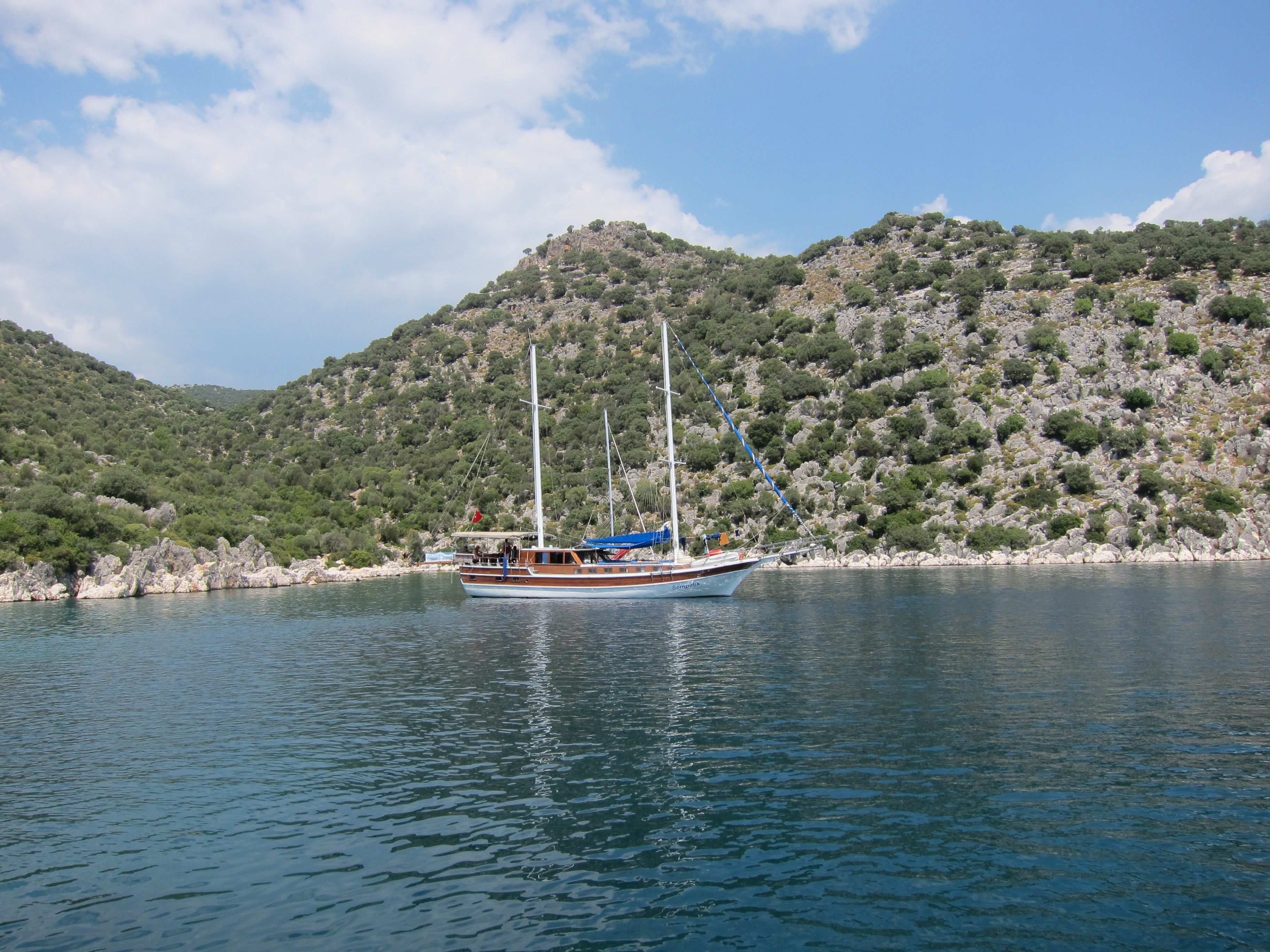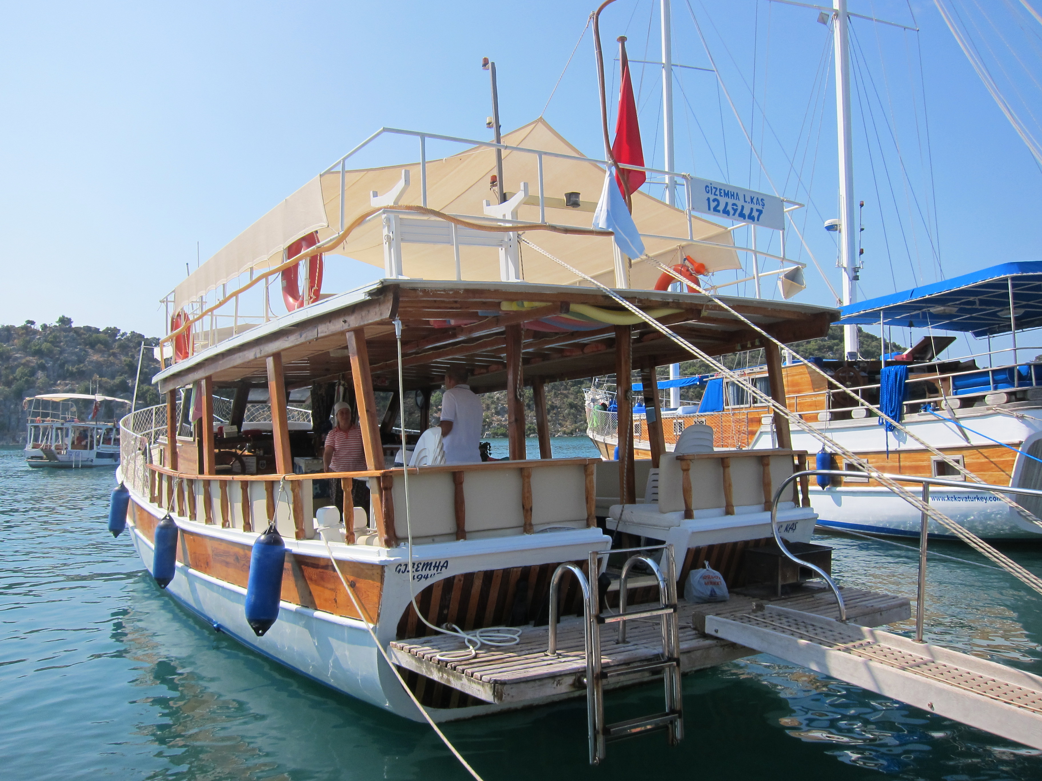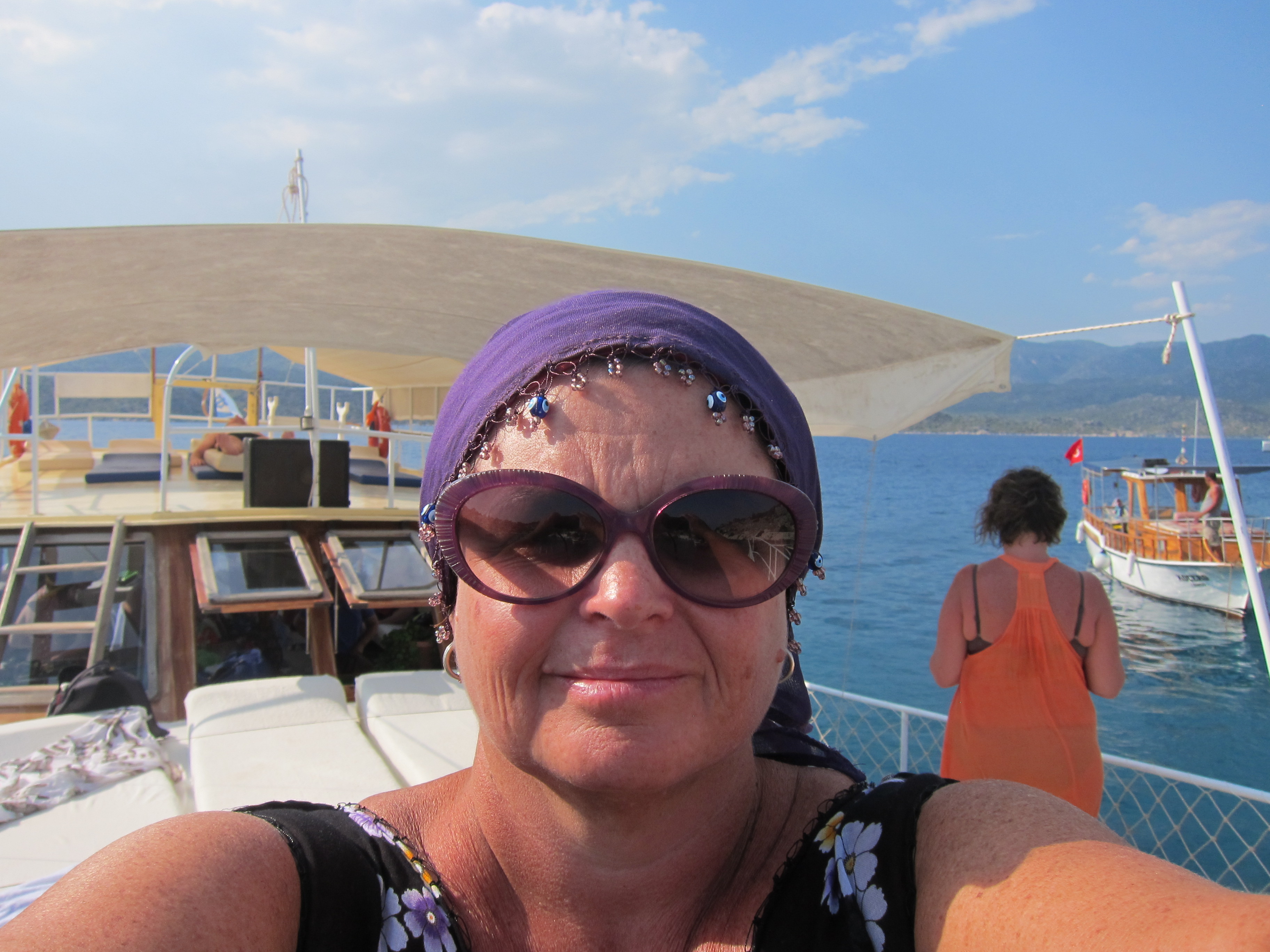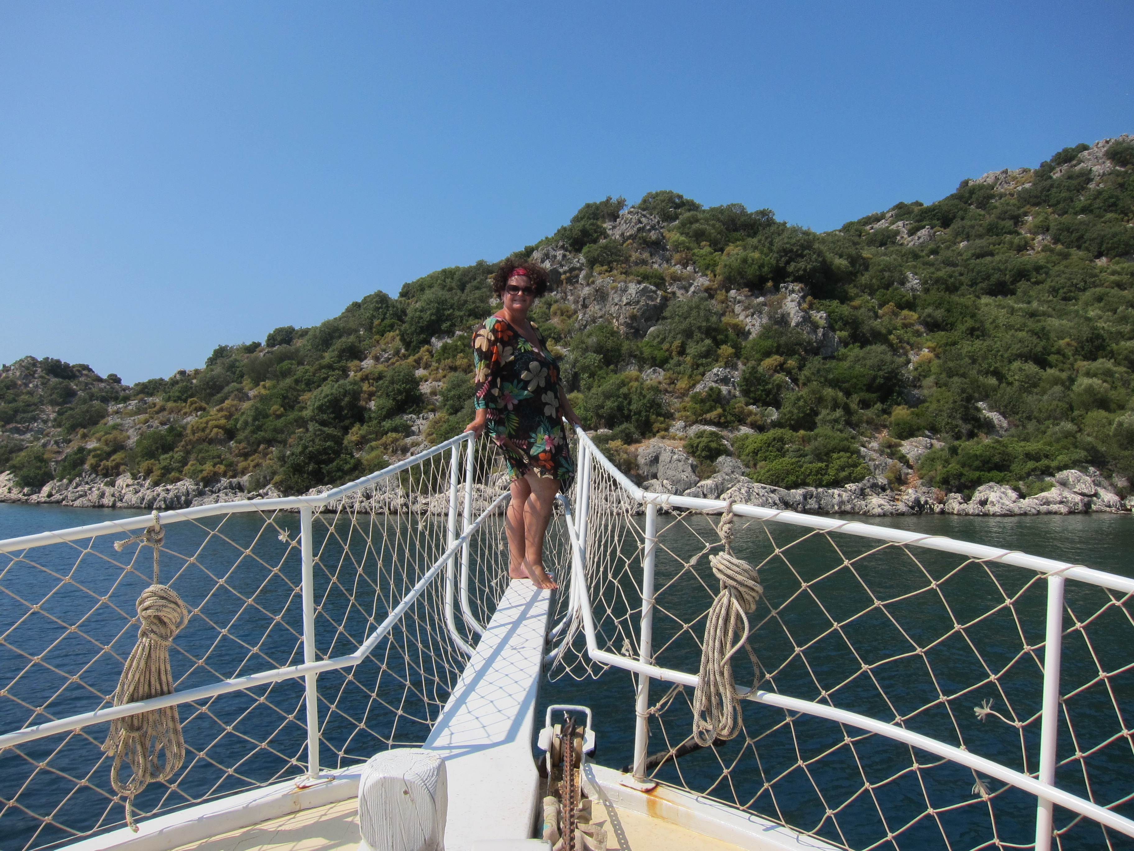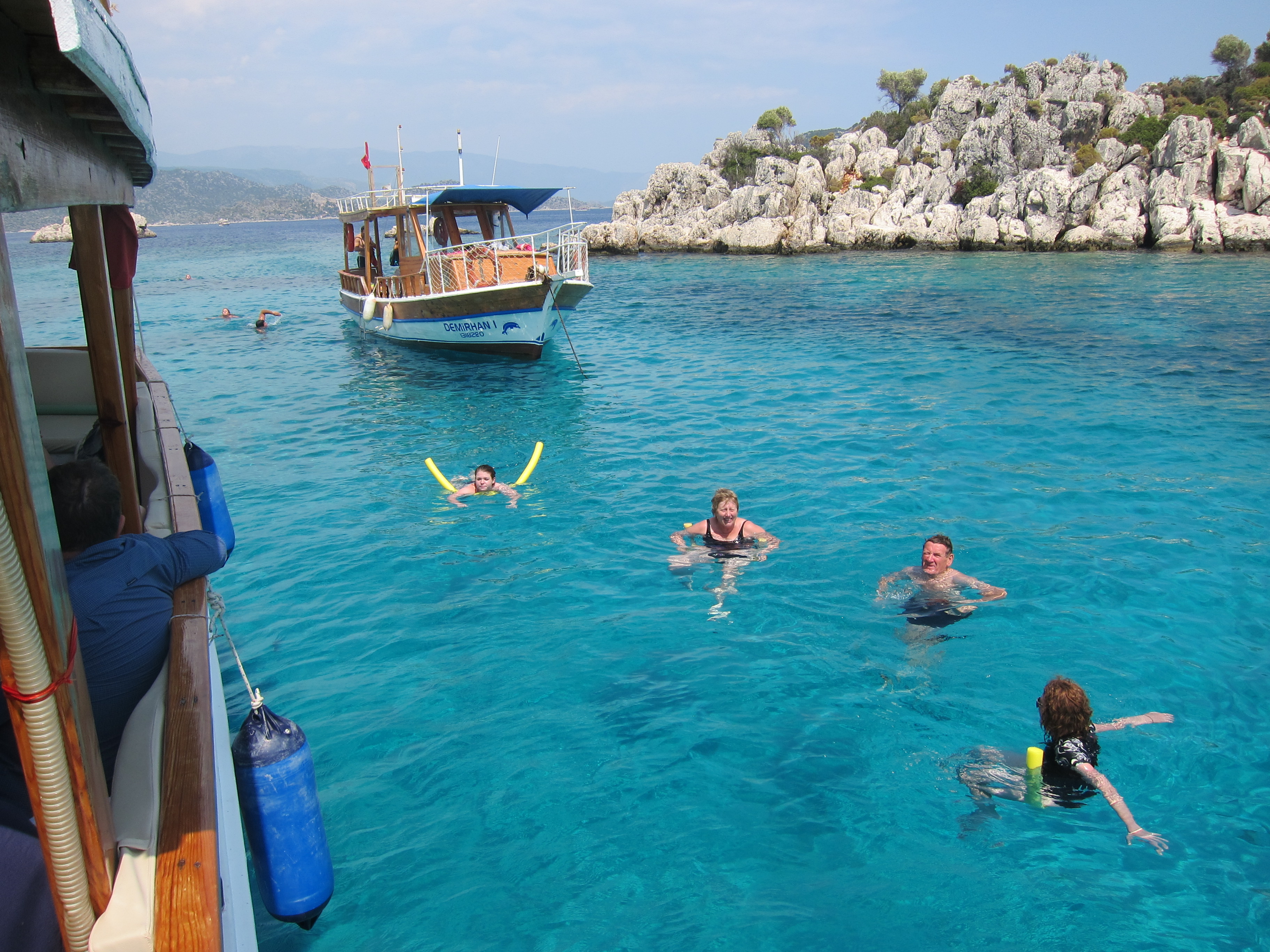 A absolutely beautiful day cruising around the bays of the Turkish coast from Kekova on a lovely boat hosted by a Turkish family. The water was sublime in colour and temperature for lots of swimming in the bays and inlets. Fresh fish barbecued for dinner! So relaxing…my kind of day!
