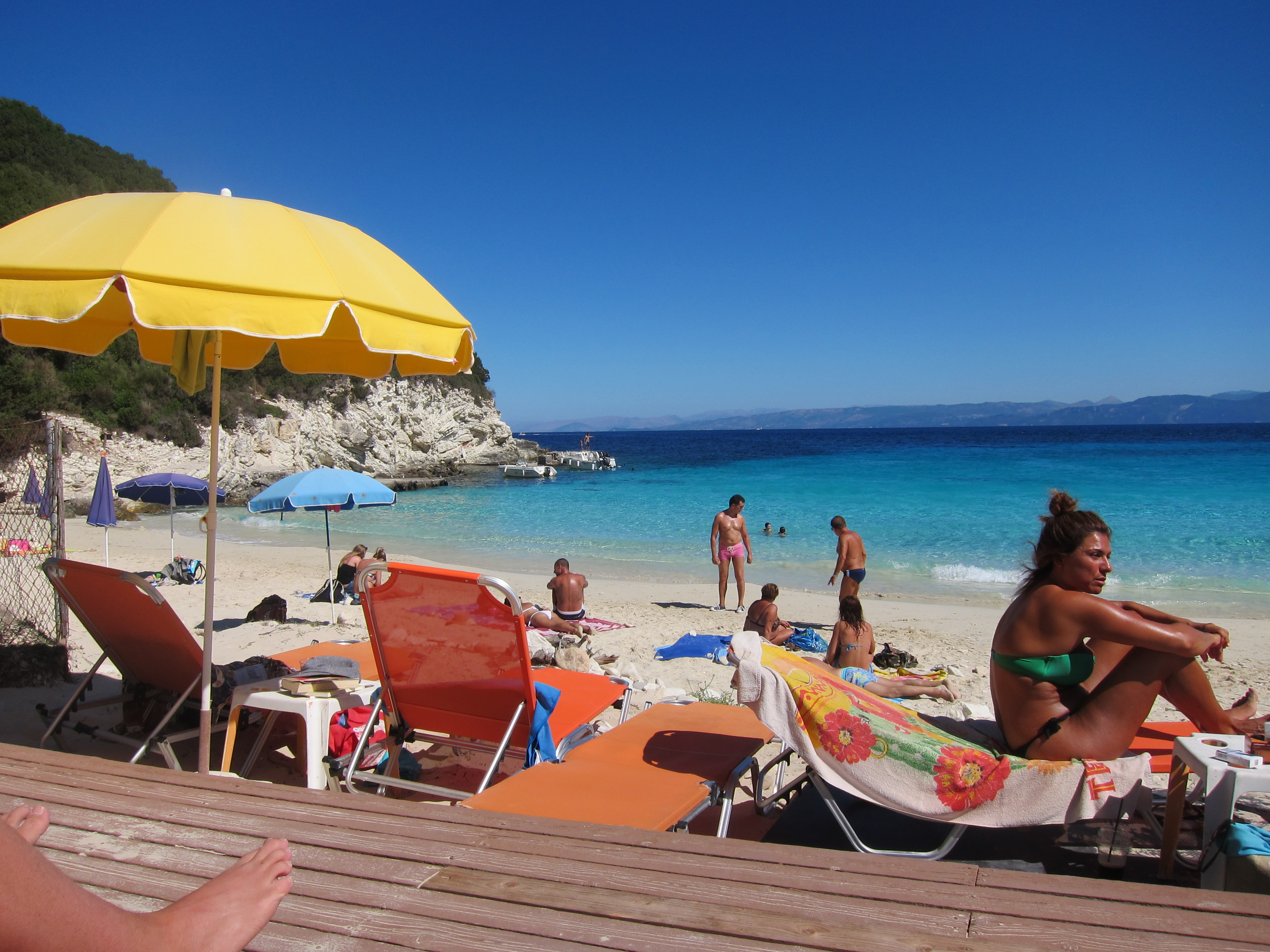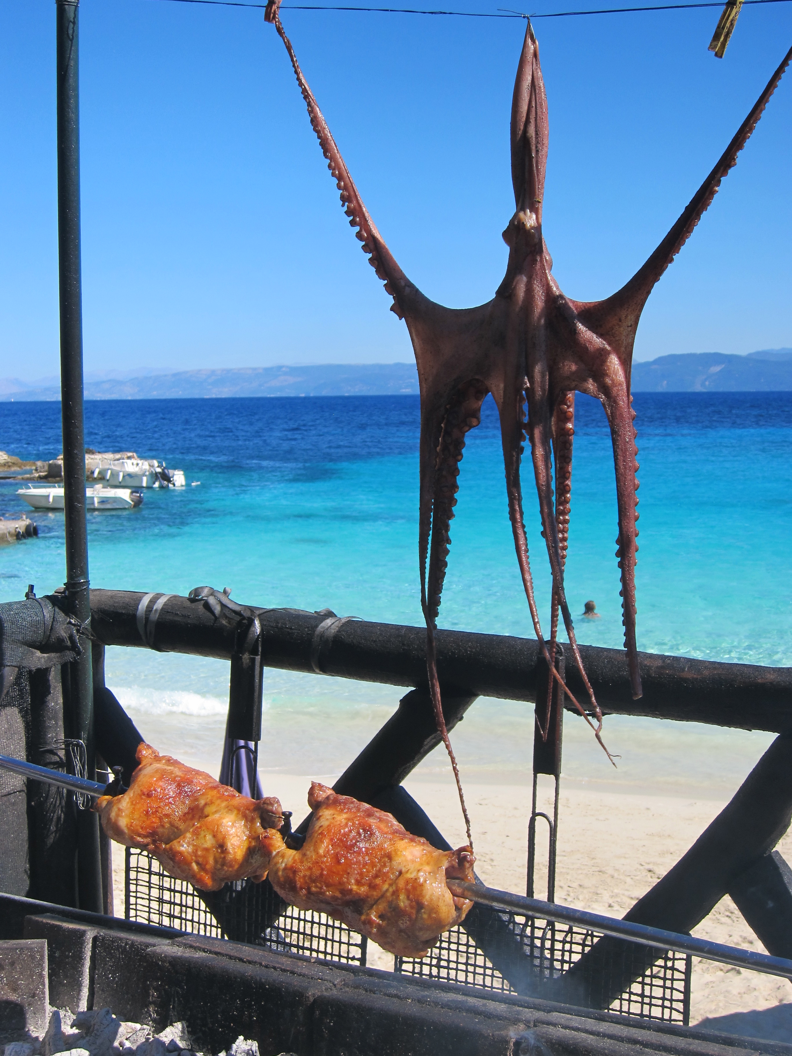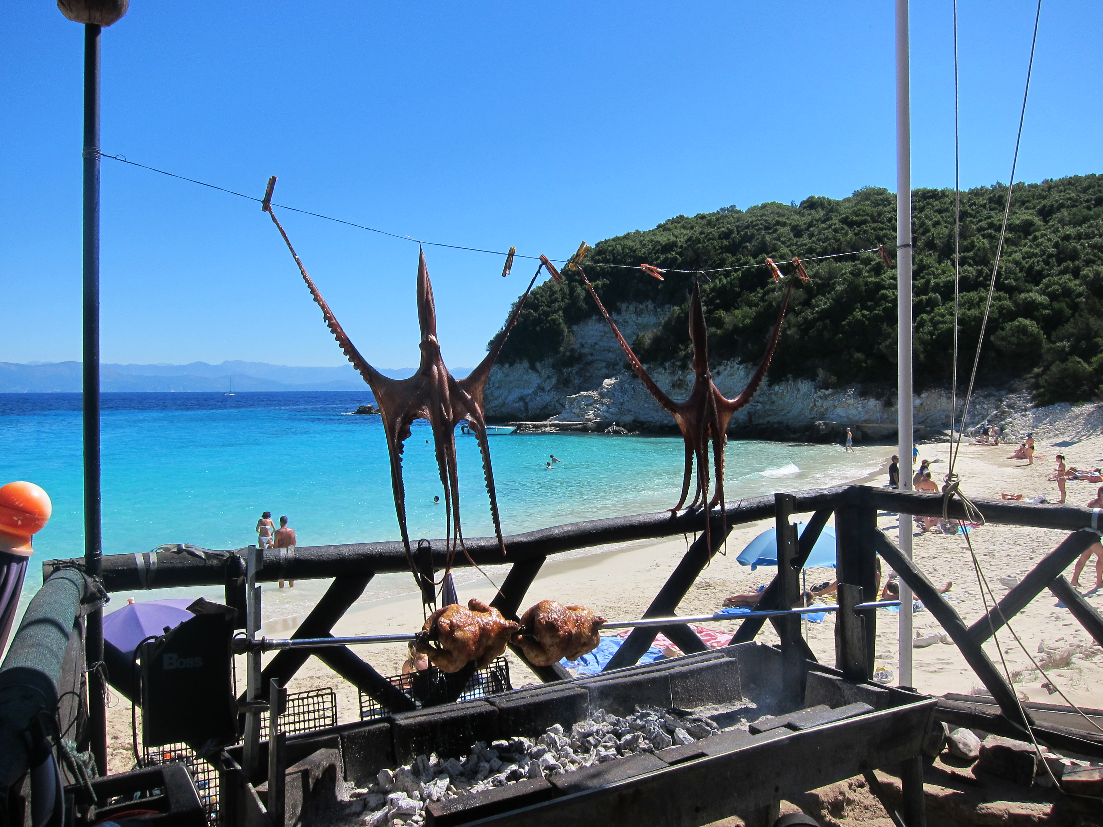 Took aboat to the small island of Antipaxos with its white sand beaches. Spent the day at Vrika Beach and lunched on seafood at Spiros Taverna on the beachfront with its drying octopus and chargrill at the front!