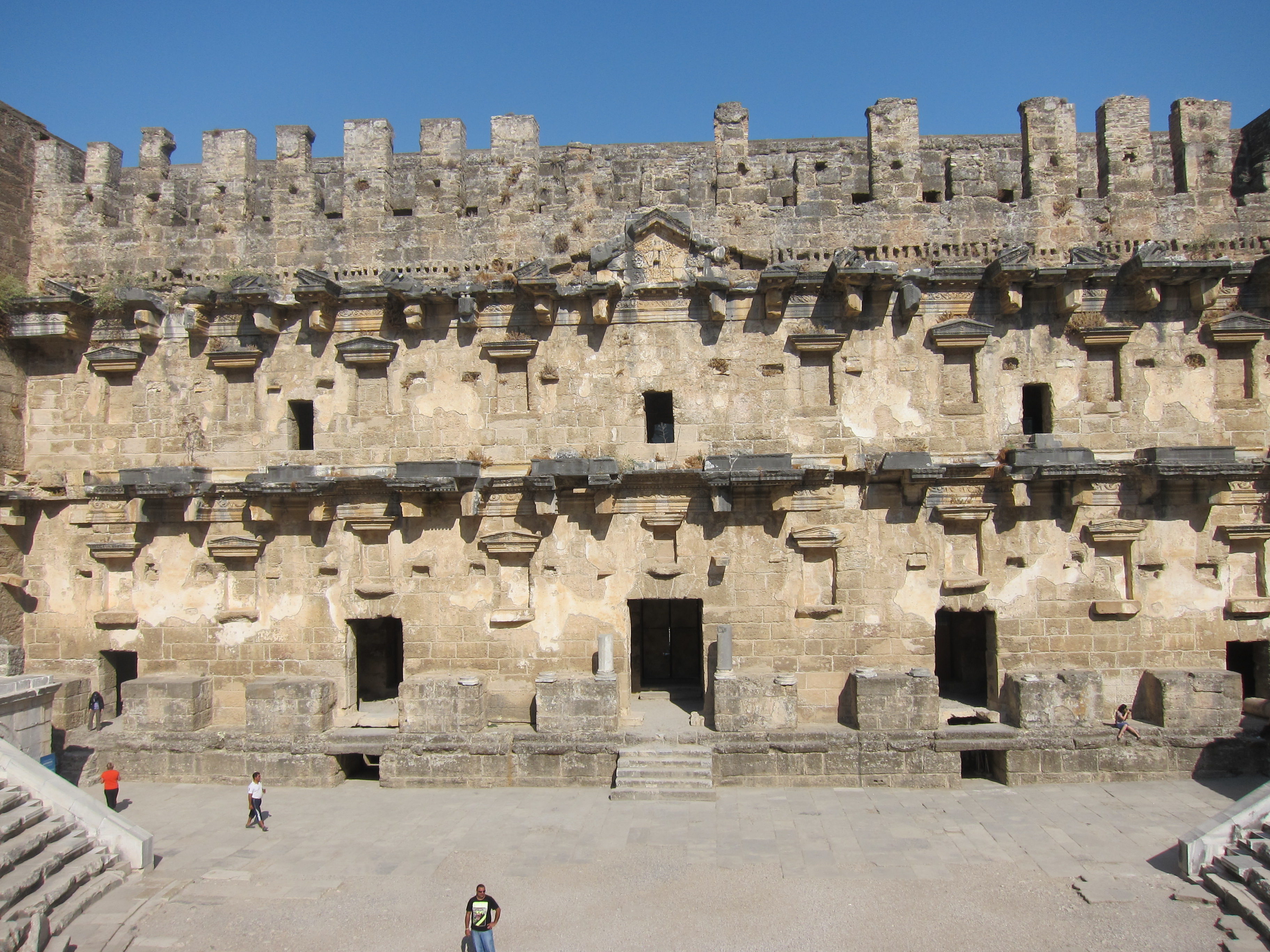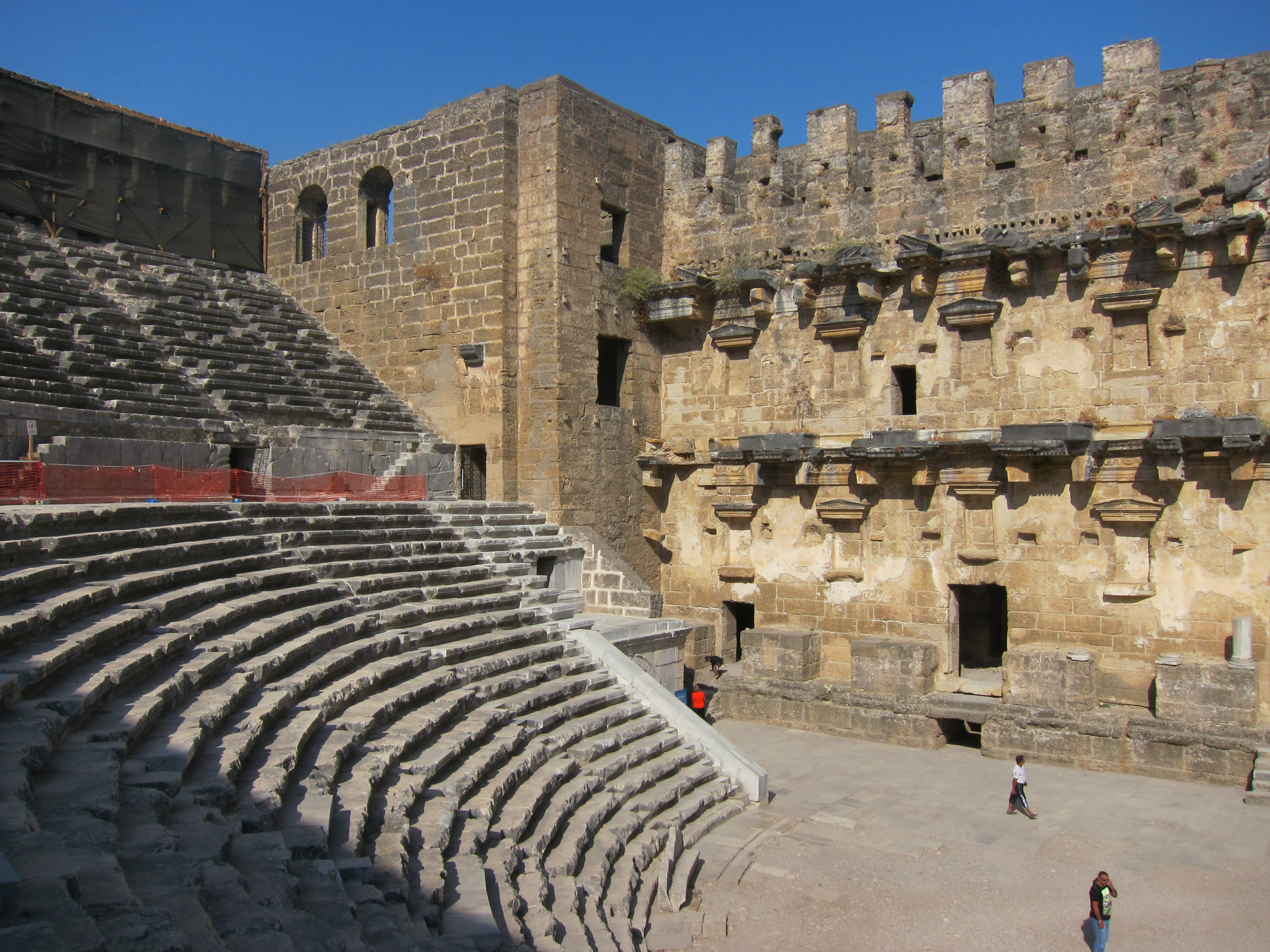 Visited the Mosque and tomb of Mervlana the founder of the Sufi and Whirling Dervishes which was just lovely but no photos allowed. Passed through flat farmland and crossed the Mountain Range to the Mediterranean coastal plain which was immediately more humid and the land quite fertile. Passed may crops of citrus, pomegranate, corn, stone fruit, vegetables and cotton which is amazingly all still handpicked here in turkey! Called in to see the ancient Roman amphitheatre of Aspendos which was stunning. Also saw an Aqueduct which are incredible feats of construction. Arrived in the city of Antalya and strolled the Mall before dinner near the main square where Muslim women were protesting in regards to a massacre in Syria they feel is being ignored. Walked home to the sound of the call to prayer again!
