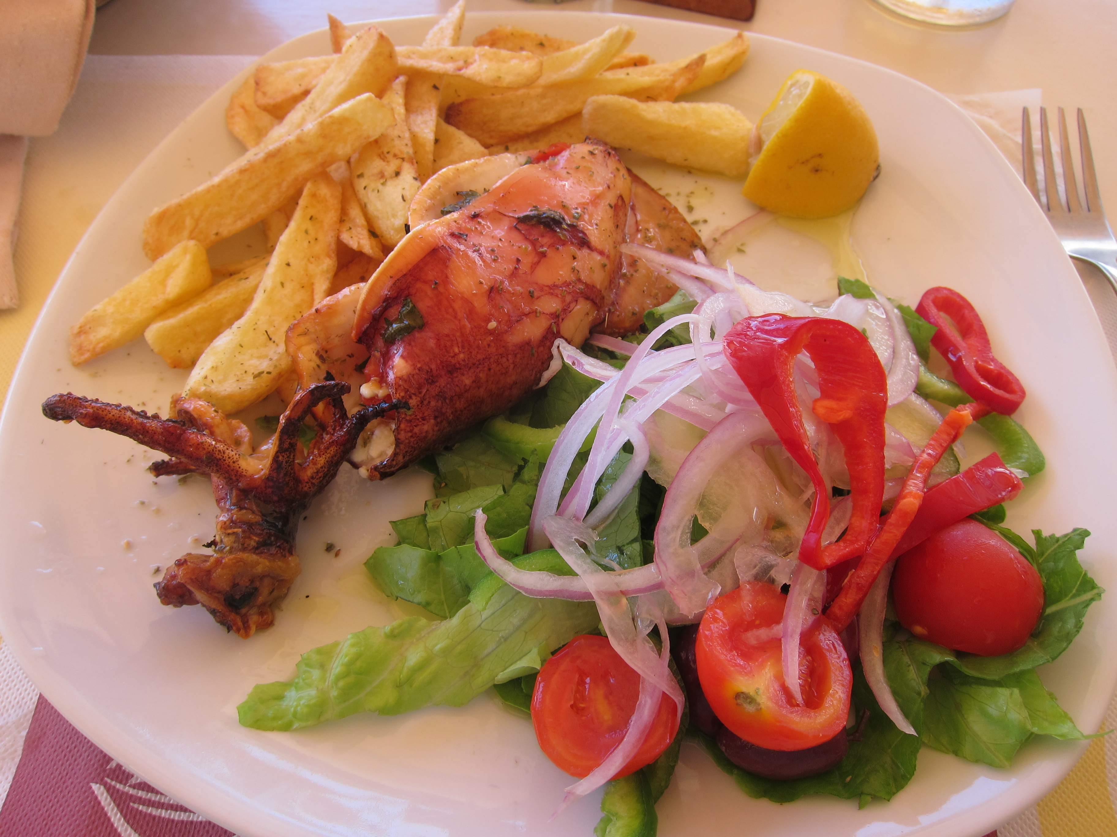 Went exploring and found old tombs of unknown origin…hand made stone cisterns to catch and store precious water…coffee on the waterfront and squid at loggos…