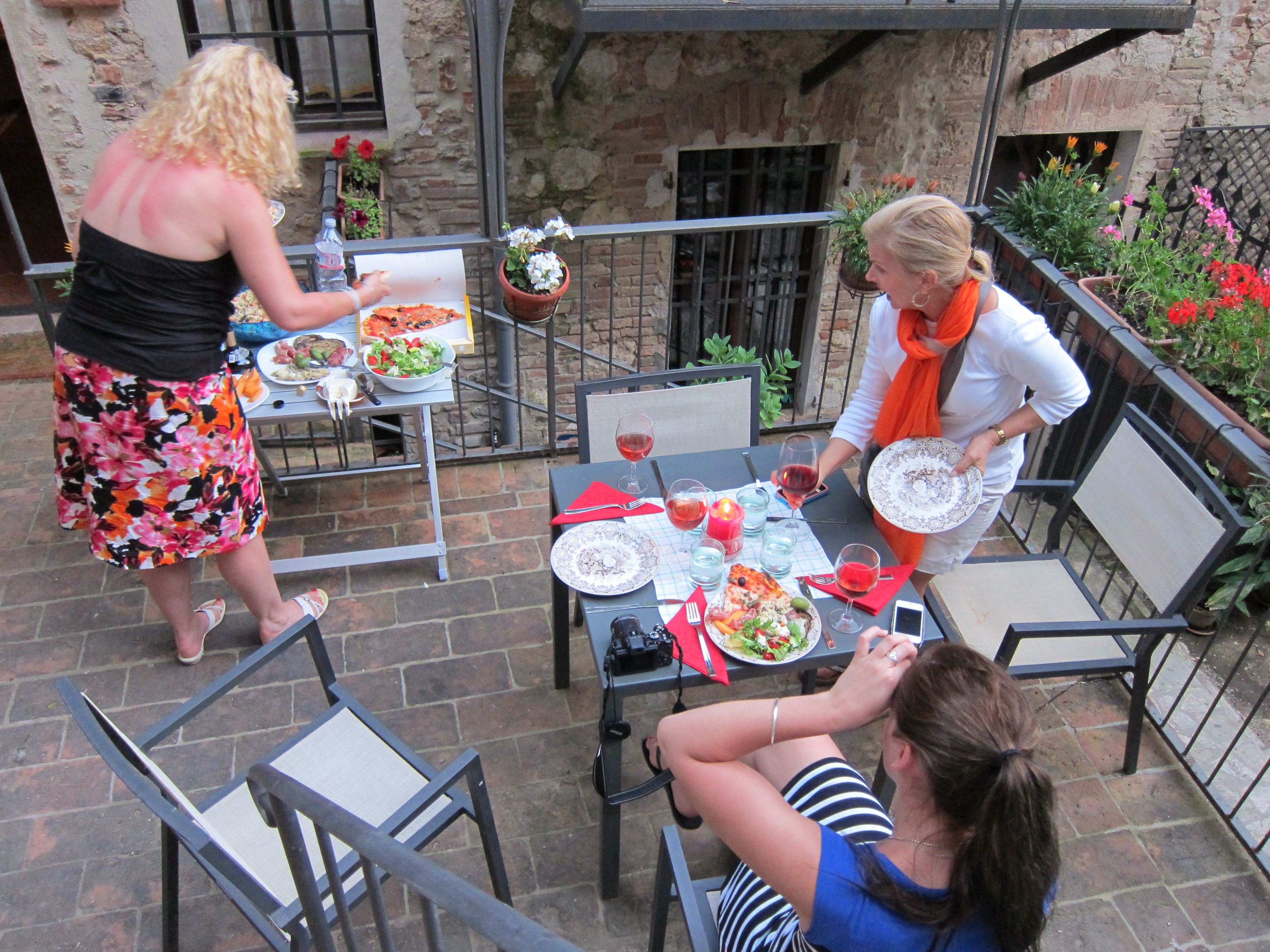 Joined the students from the language school for drinks on the terrace at Wine bar Lucevan Le Stelle before dinner with Jen, Ruth and Anne who we farewelled. Jen moved into my apartment for a week to continue her studies at Il Sasso language school, so its nice to have some more company. Clare from Texas had lunch with us and a lovely afternoon relaxing and spending some time on the terrace in the cool shade of the pine. Sunday was Jen’s birthday so after some dolce we went to Lucevan Le Stelle and Clare and Lucy(UK) met us to share a bottle of Prosecco then a bottle of Italian style champagne. We then came home and had a ‘pot luck’ dinner or as we know it ‘bring a plate’ dinner on the little terrace with Carol(Canada) and Karen( Texas, USA). I felt sorry for the girls the next morning as they all had to get up and go to Language classes!